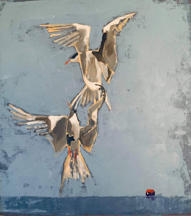 The idea of "Locals" came from my love of birds and of Rye Harbour nature. I began to sketch them when birdwatching during lockdown and was inspired to paint their beauty and individuality. The exhibition at Rye Bank Gallery reflects where I am in my life at present. I’m at the nature reserve every day; I do a circuit and count the bird numbers and see the ever-changing landscape of the reserve. The challenge has been duplicating this into my paintings, which I have thoroughly enjoyed. I have recently been inspired by the Scottish colourists with their finer brush strokes and colour and this new work is a conscious move away from my previous exhibition where I used elements of graffiti.