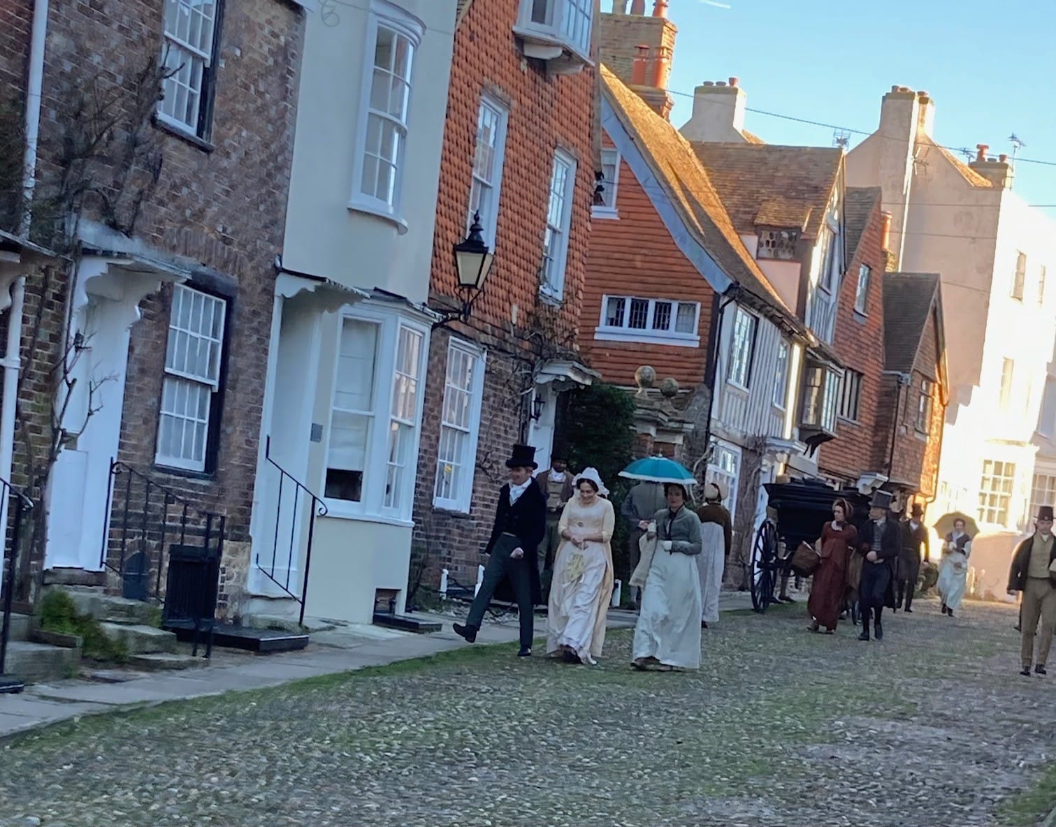 From viewing the activity, I can confirm that crews come with enormous numbers of large white vans filled with vast amounts of electrical equipment. But, a bit like war, there are hours and hours of boredom interspersed by moments of action. Poor lovies. I had a long chat with the ‘coachman’, who was driving the little gig and the slightly hairy pony up the cobbles in the film, who both waited for a very long time for their moment to shine. The pony also had a stout rug, I was pleased to see.