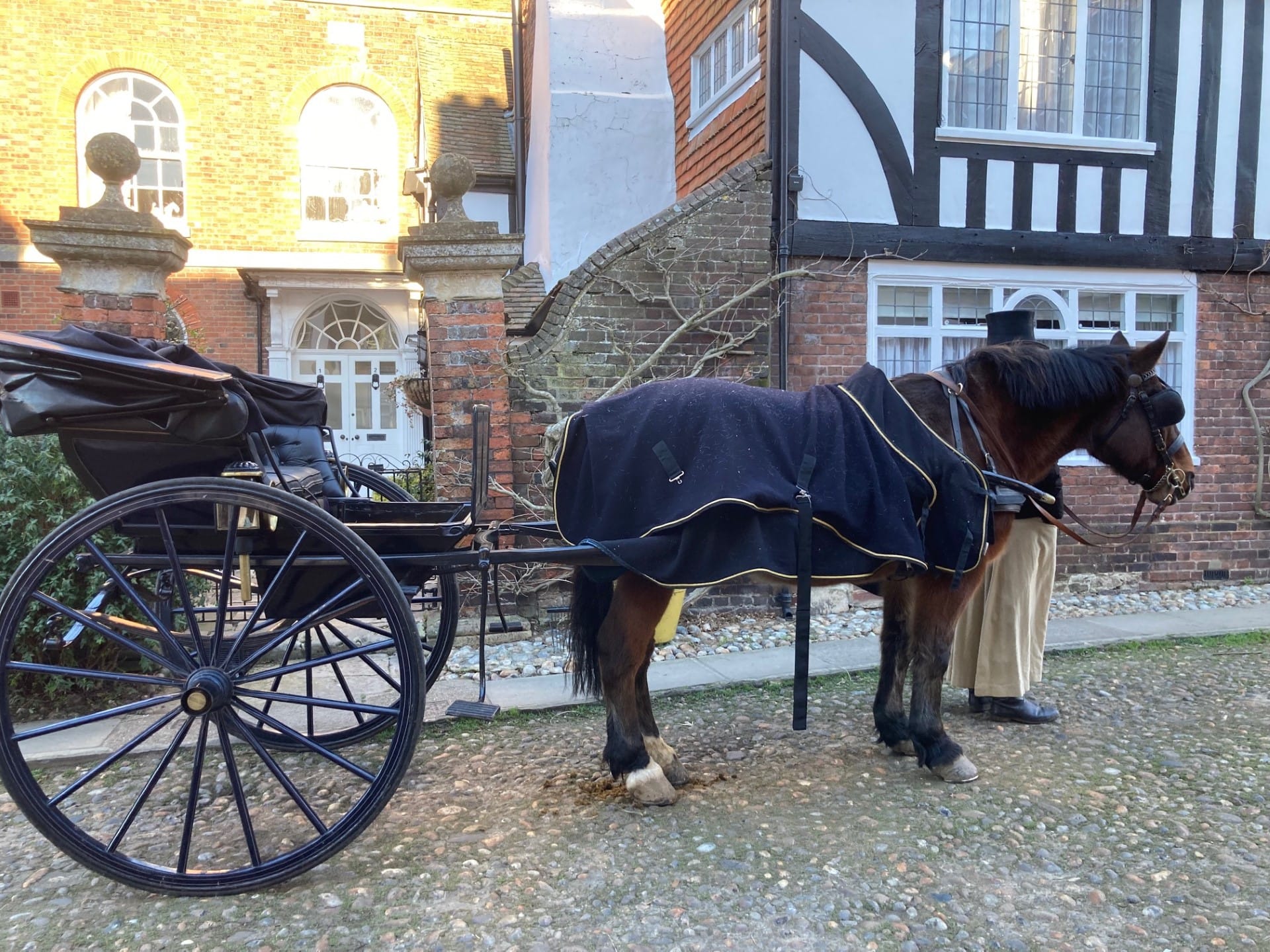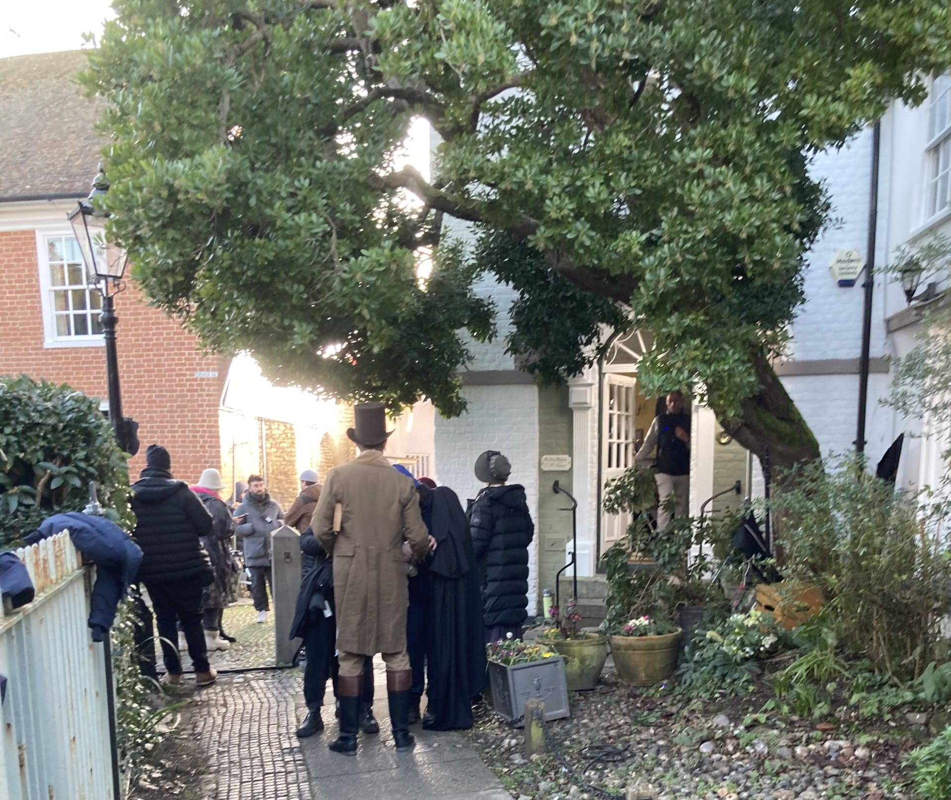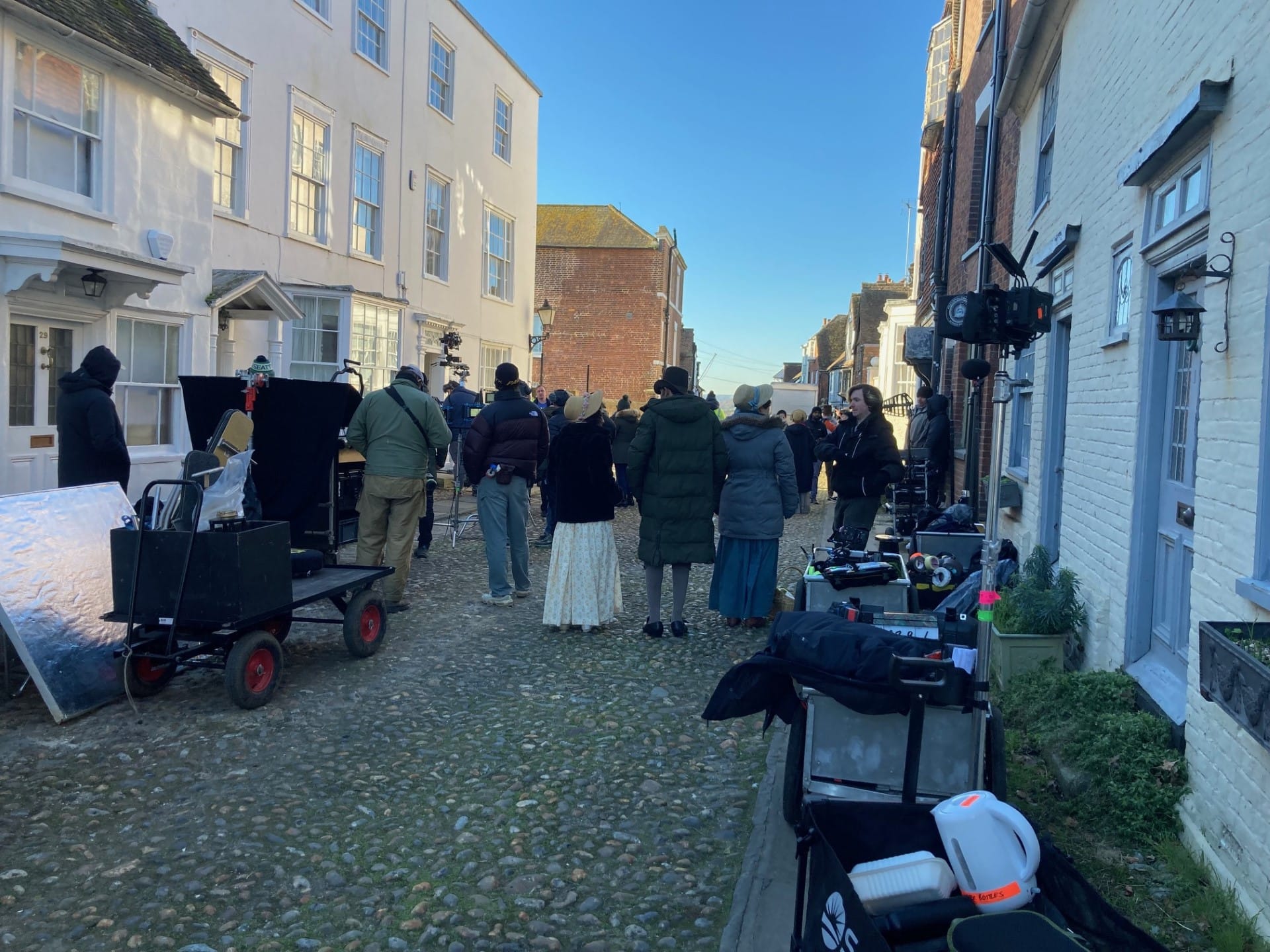 From viewing the activity, I can confirm that crews come with enormous numbers of large white vans filled with vast amounts of electrical equipment. But, a bit like war, there are hours and hours of boredom interspersed by moments of action. Poor lovies. I had a long chat with the ‘coachman’, who was driving the little gig and the slightly hairy pony up the cobbles in the film, who both waited for a very long time for their moment to shine. The pony also had a stout rug, I was pleased to see.