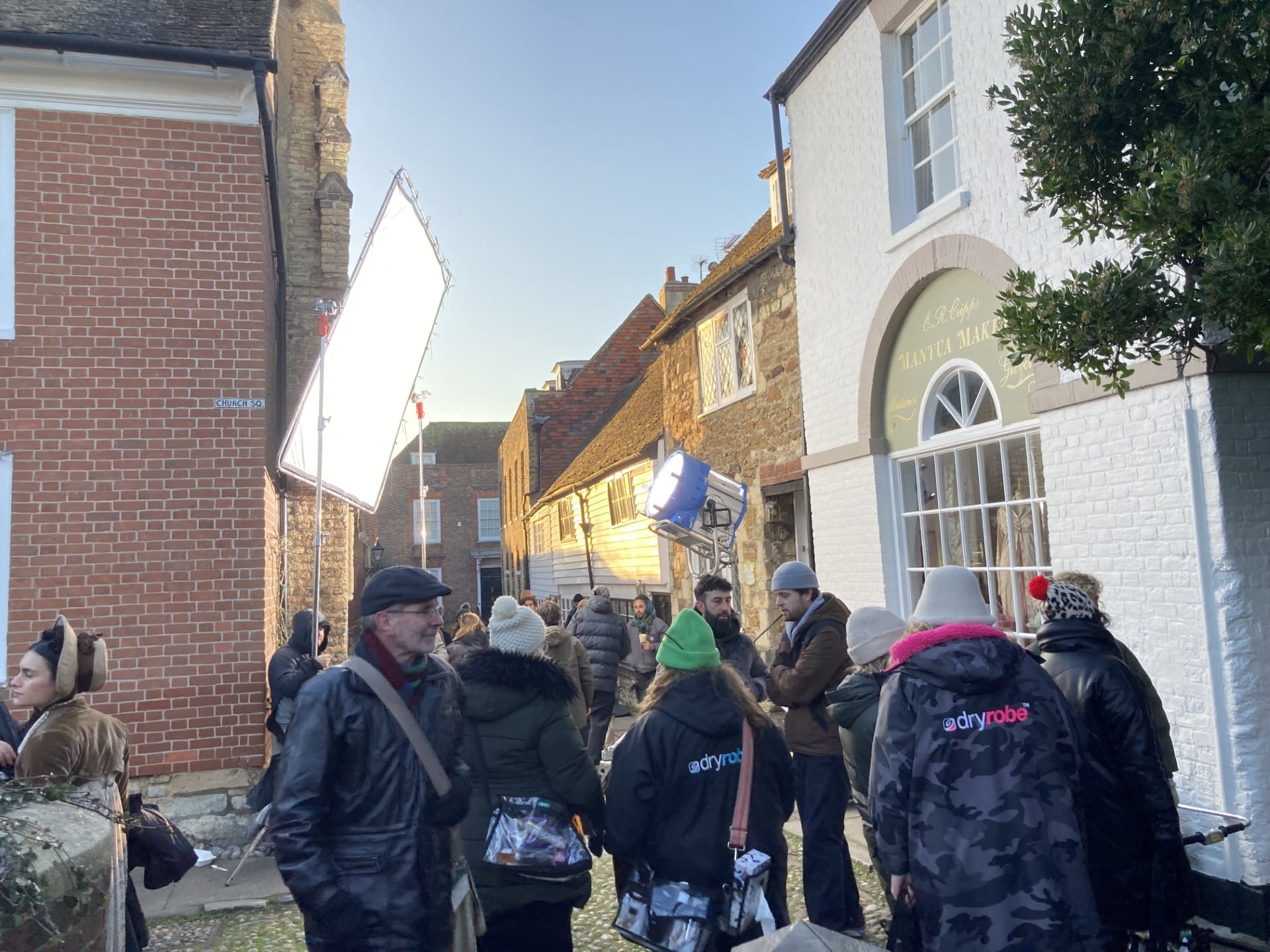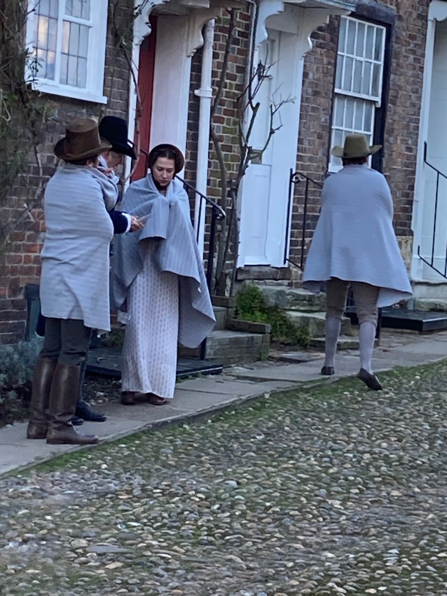At 7.30 am on a freezing cold January 18, filming and preparing to film along Watchbell Street (and in a couple of the houses) started promptly, with grey blankets being passed around to the cast and extras like cigarettes in a war film. They were all wearing period costumes too fine and too thin to be of any use in the minus zero temperatures.