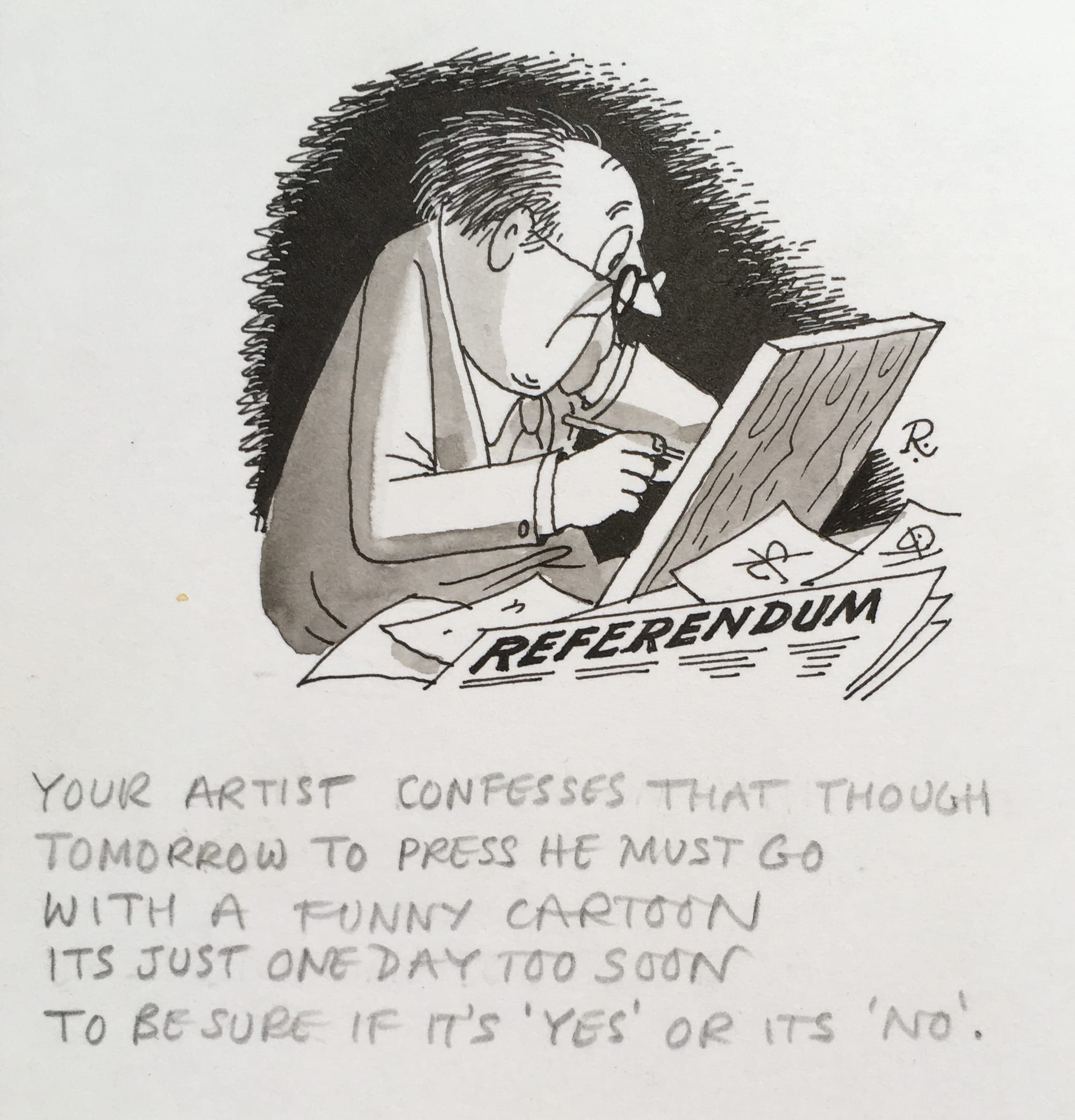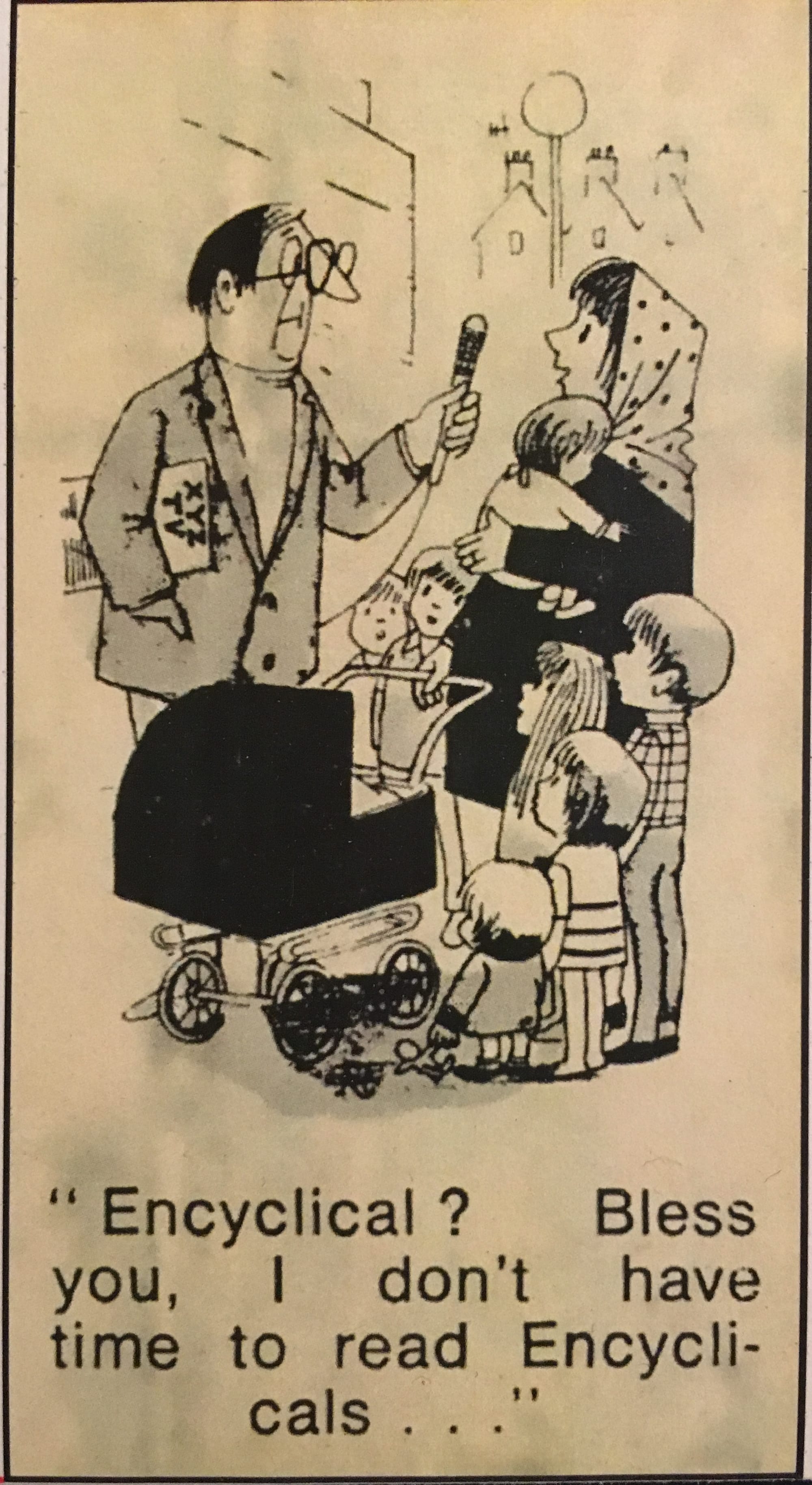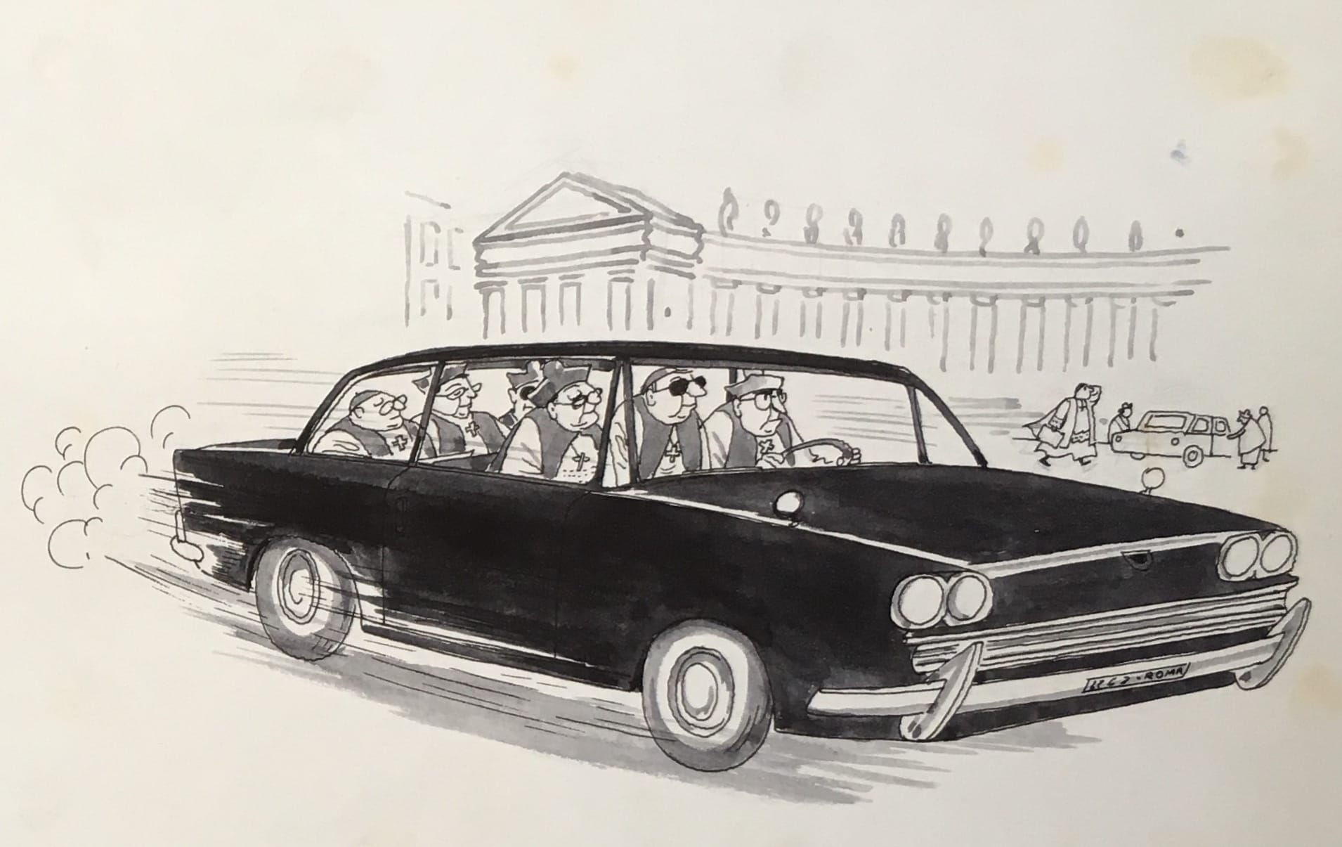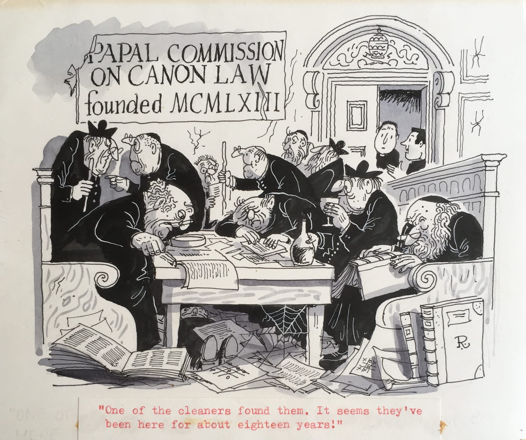 In Indian ink, white gouache for highlights and ‘zippatone’ for greys, the ‘goings on’ in Rome or in typical English Catholic – and Anglican – parishes would be depicted, through my father’s balanced and humorous lens. Priests and vicars, the zealous and the religiously indifferent, would appear, never sneered at but gently provoking a chuckle. As for me, I was utterly unaware in my teenage years of the rich source material from which my father found his inspiration: Vatican 2, Humanae Vitae, tumult and turbulence in the Church.