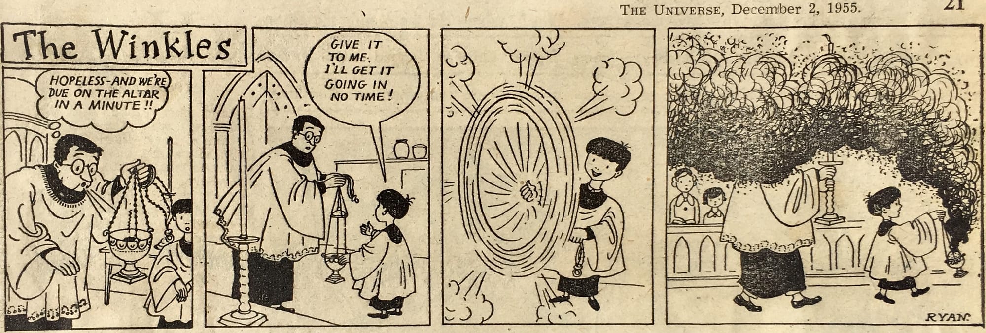 In the 1960s and 70s I was living at home in London with my parents John and Priscilla Ryan. Every Tuesday morning, my pa would come downstairs from his attic studio and say: ”Hmmm WHAT am I going to do for my Catholic Herald cartoon this week?!” A thorough read of The Times, a listen to the news on Radio 4, a consultation with the Catholic Herald’s editor and a cartoon would appear, rushed by taxi to the paper’s office ready for publication – once Priscilla had rubbed out the pencil lines of the initial sketch!