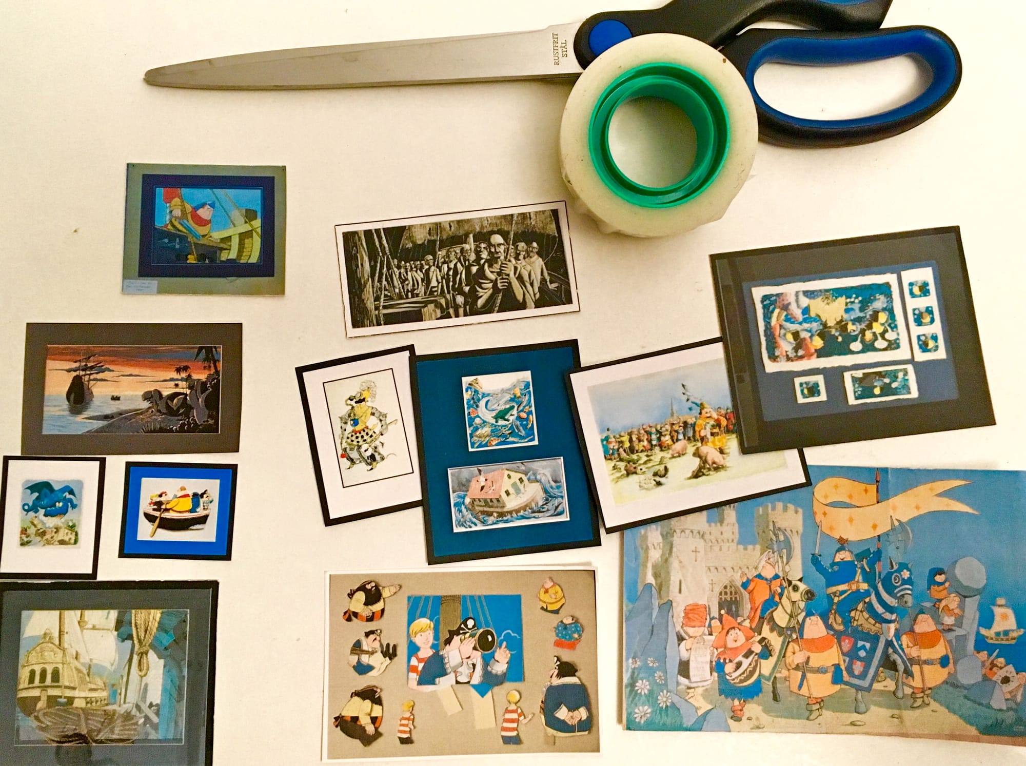 And then I was rescued: the gallery’s curator Isabelle Sambrook requested a display “concentrating on John Ryan’s other characters as well as on Pugwash”: what about Sir Prancelot, Mary Mungo & Midge, Cardinal Grotti and the rest? This godsend of a decision focused my mind and gave us a title: John Ryan’s Captain Pugwash and Friends. I could visualise the walls of the Stormont Room with separate clusters of fabulous characters from cartoon, book and TV film: The Hunting of the Snark here, Saint Christopher there, Dodos to the right, Harris Tweed to the left - and so on. To keep each wall lively, there should be a combination of large and small images, colour and monochrome, finely-painted book illustration and TV film cardboard cut-outs. Comic strip would mingle with poster, and newsprint with gouache.