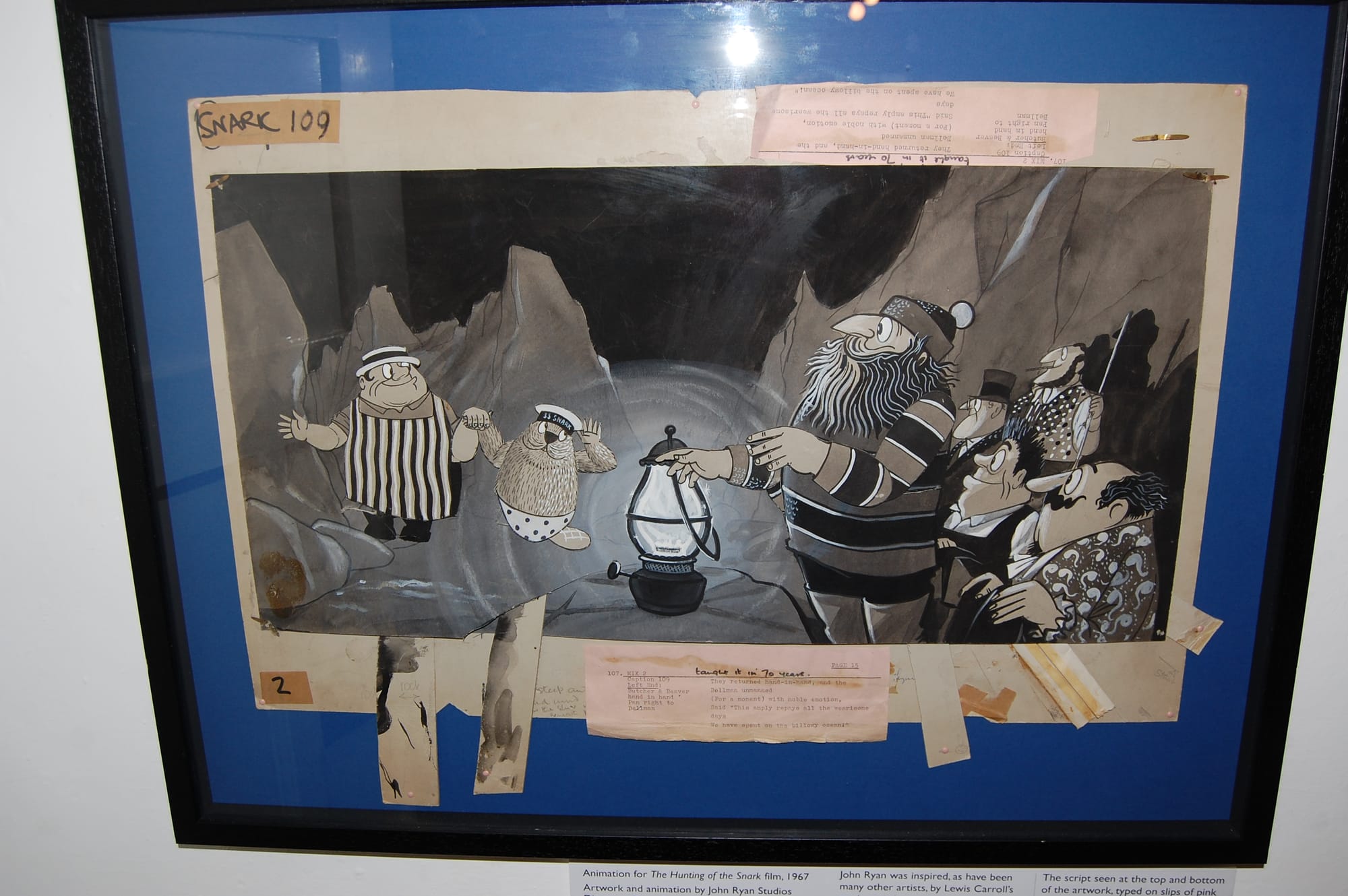 The exhibition shows John as his modest and whimsical self, a wonderful story-teller with a sense of humour heightened by supreme artistic mastery, whichever medium he chose. This was demonstrated, for example, by his 1960s production for Rediffusion TV of Lewis Carroll's nonsense poem: "The Hunting of the Snark". This was a 30 minute sequence animated characterisation as seen in the image to the right. Isabel's partner, Nick MacRae, called this an early monster movie. The original film reels were lost, he said, possibly languishing in an unexplored attic.