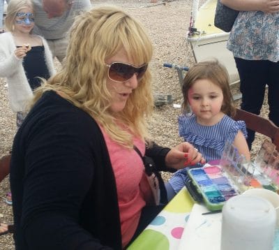 As the tide came in, the wind got up to a moderate to fresh breeze, but not enough to cancel the free taster sails that attracted just under 60 people, of all ages, to have a go at sailing in a dinghy with an experienced volunteer skipper. The day got underway and the sun shone through the clouds. People, waiting in excited anticipation, watched the boats being rigged for their first taster sails, children had a chance to have a go on Pirate Jake’s bouncy castle and have their faces painted by Maria Walker from Mimi’s face painting, and the glitter tattooist Joanna Baker. The tombolas and children’s games went go down well with everyone and there was plenty to look at and buy on the bric-a-brac and cake and produce stalls.