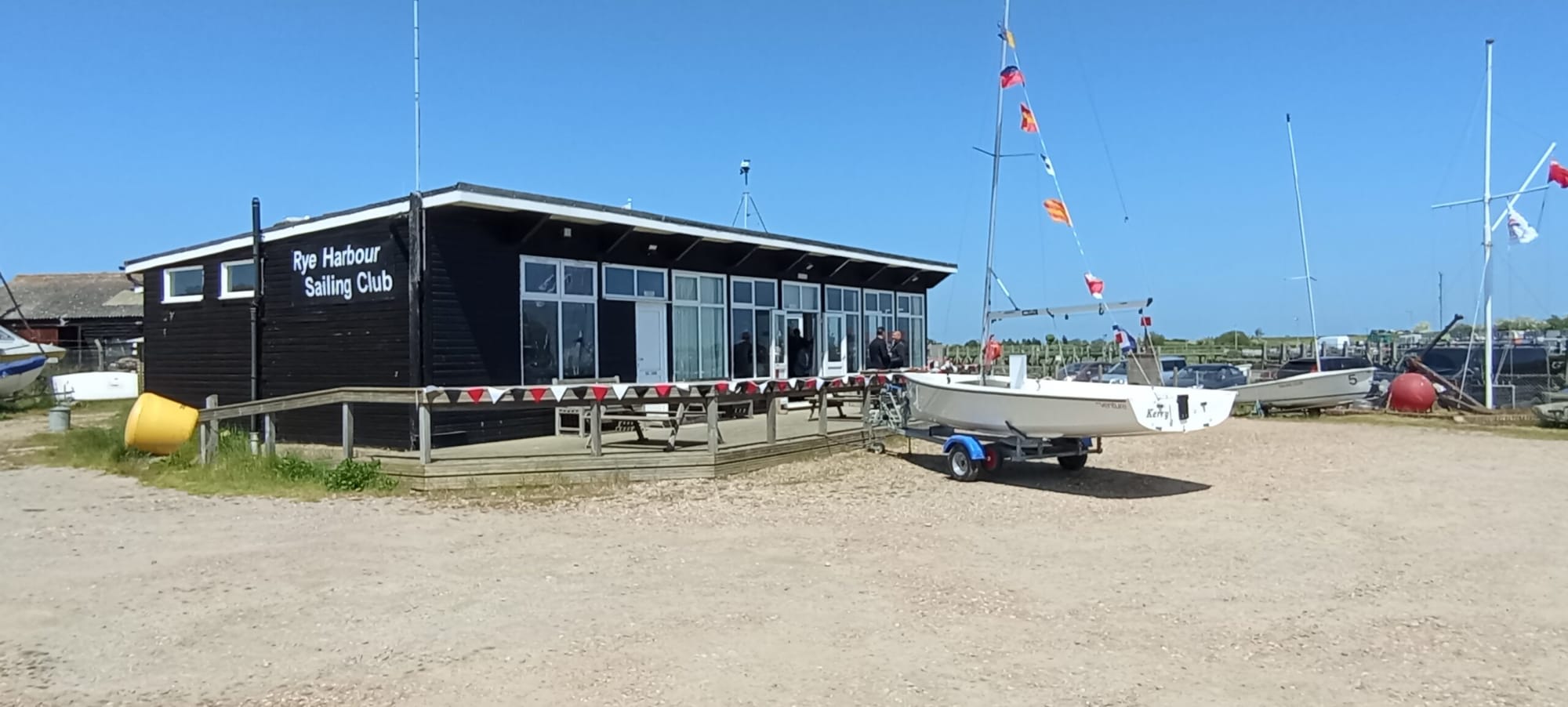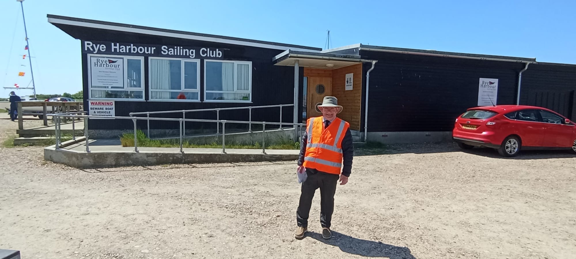 Responding to the kind invitation from Caroline Wylson, chair of Rye Harbour Sailability (RHS), I arrived at Rye Harbour Sailing Club last Friday and was met at the car park entrance by Crispin Farrant (a trustee) whose job today was car park attendant. The sun was shining, the blue sky reminded us it’s nearly summer and, had it not been for the strong breeze, we could have been in the Med.
