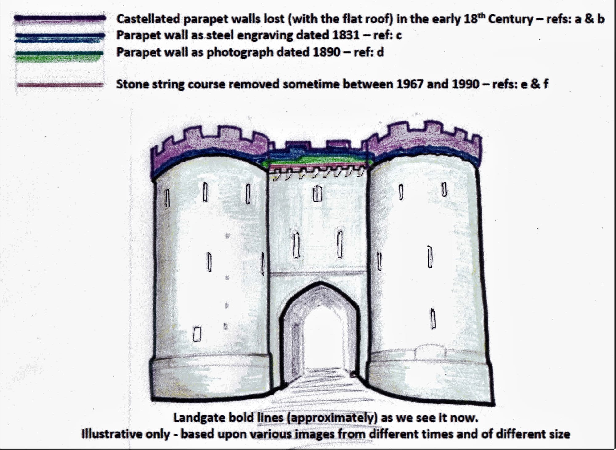 Drawings/sketches a & b from the mid-17th century (1633 and 1659) show the Landgate with castellated parapet walls at the top. The flat roof/deck behind the parapet walls provided a place from which stones and hot liquids could be dropped onto attackers outside the entrance.
