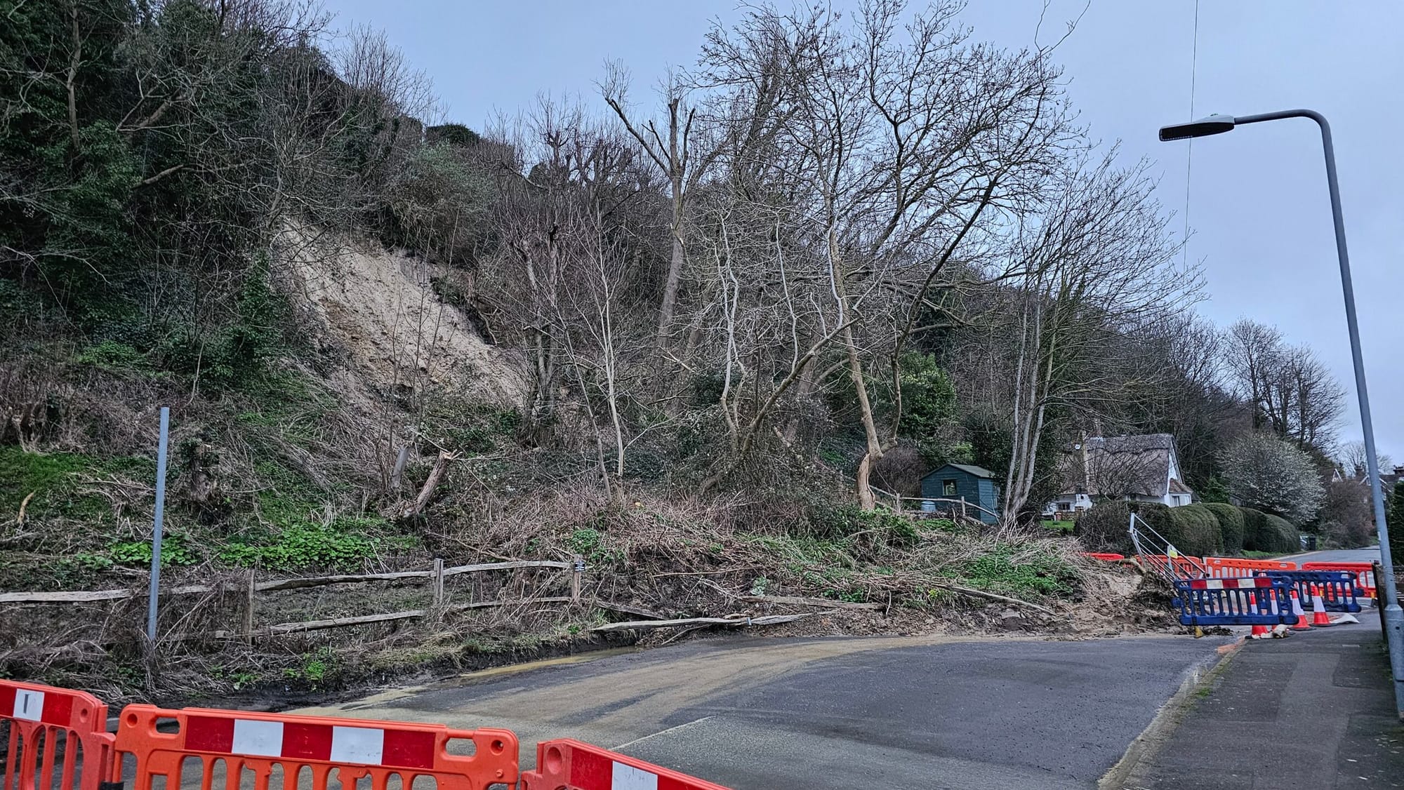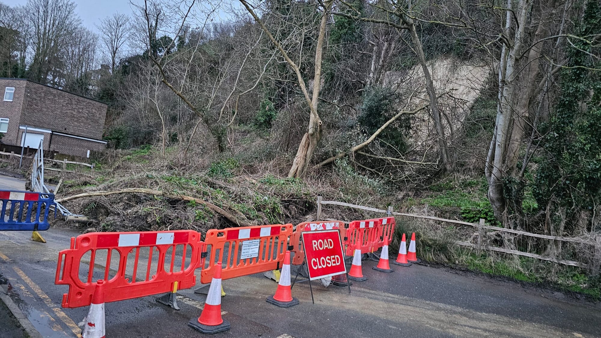 On Tuesday afternoon there was a significant landslip of topsoil and vegetation onto Military Road, 200 yards to the east of the Globe Inn. After the recent heavy rainfall, ground water in the Rye Hill escarpment had loosened the surface, causing several tons of debris to slip and block the road. At 7:30 am on Wednesday February 21 the road remained blocked.