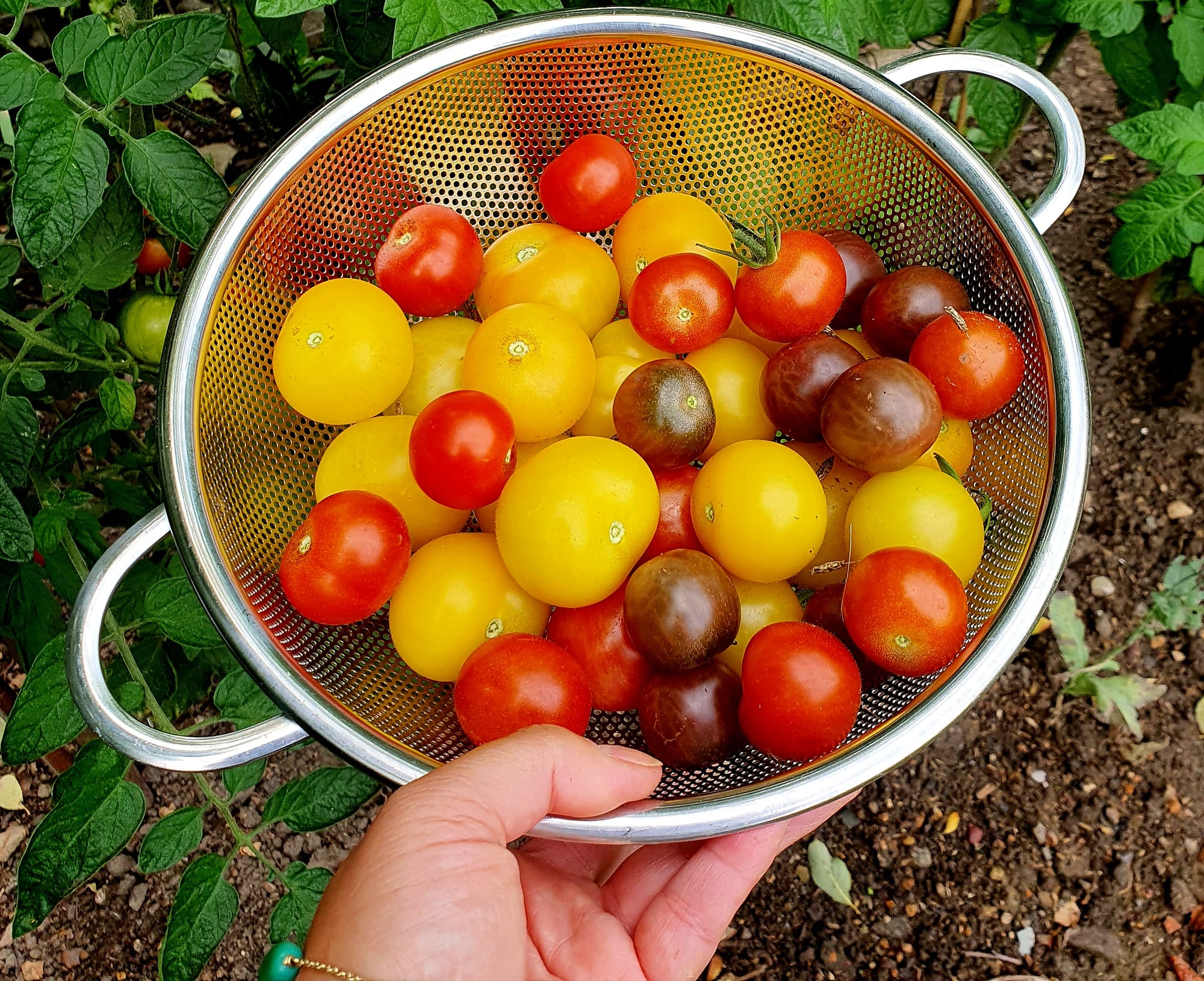 We planted out our tomatoes in mid May. 2021 had been a bad year for us. We got a poor crop and blight. Sergio, from strong northern Italian farming stock, had previously been able to grow bowls of fruit, from balconies in London, to his kitchen garden in East Sussex. We prefer the sweeter, more flavoursome small tomatoes and went with Tigerella, Black Opal, Gardener's Delight and Golden Sunrise. It proved to be such a good year that we were still collecting, eating and cooking with them in November.