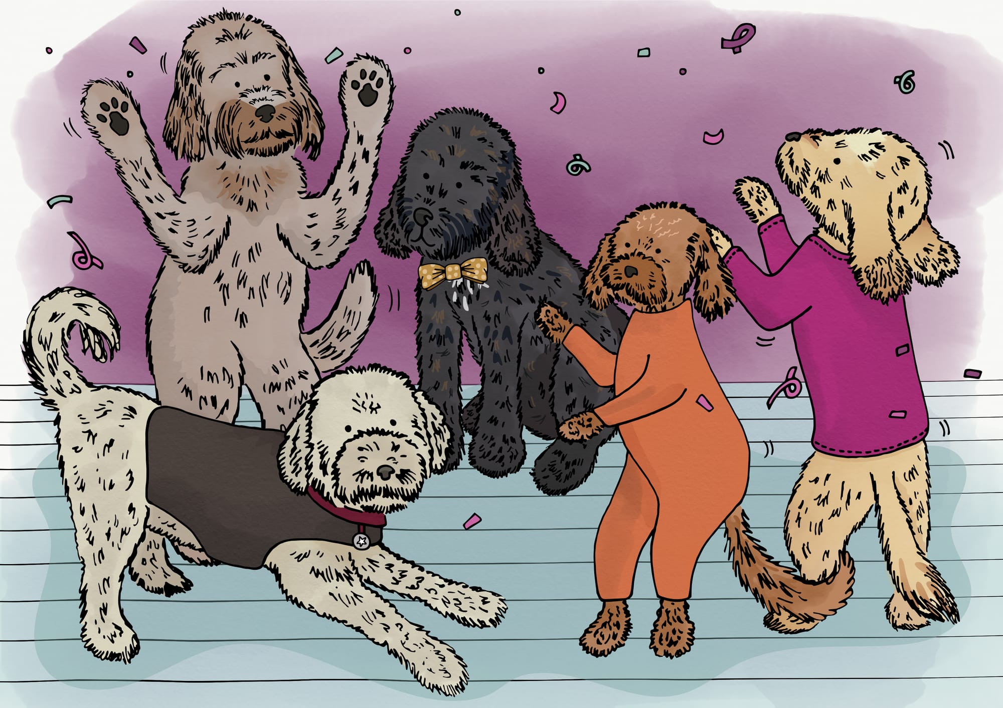 As the sun went down and the evening drew in, the doodles started to drift off home with lots of hugs and “see you soons”. Eventually it was just the five Camberdoodles left listening to Jangles and The Doodlettes. They were all lost in their thoughts as Jangles sang the slow ballad ‘love me tender, love me do’. What a special day it had been, How lovely it had been to see Poppy, Lacey, Dexter, Matilde, Hector, Harvey and Molly, and how happy they’d been together.
