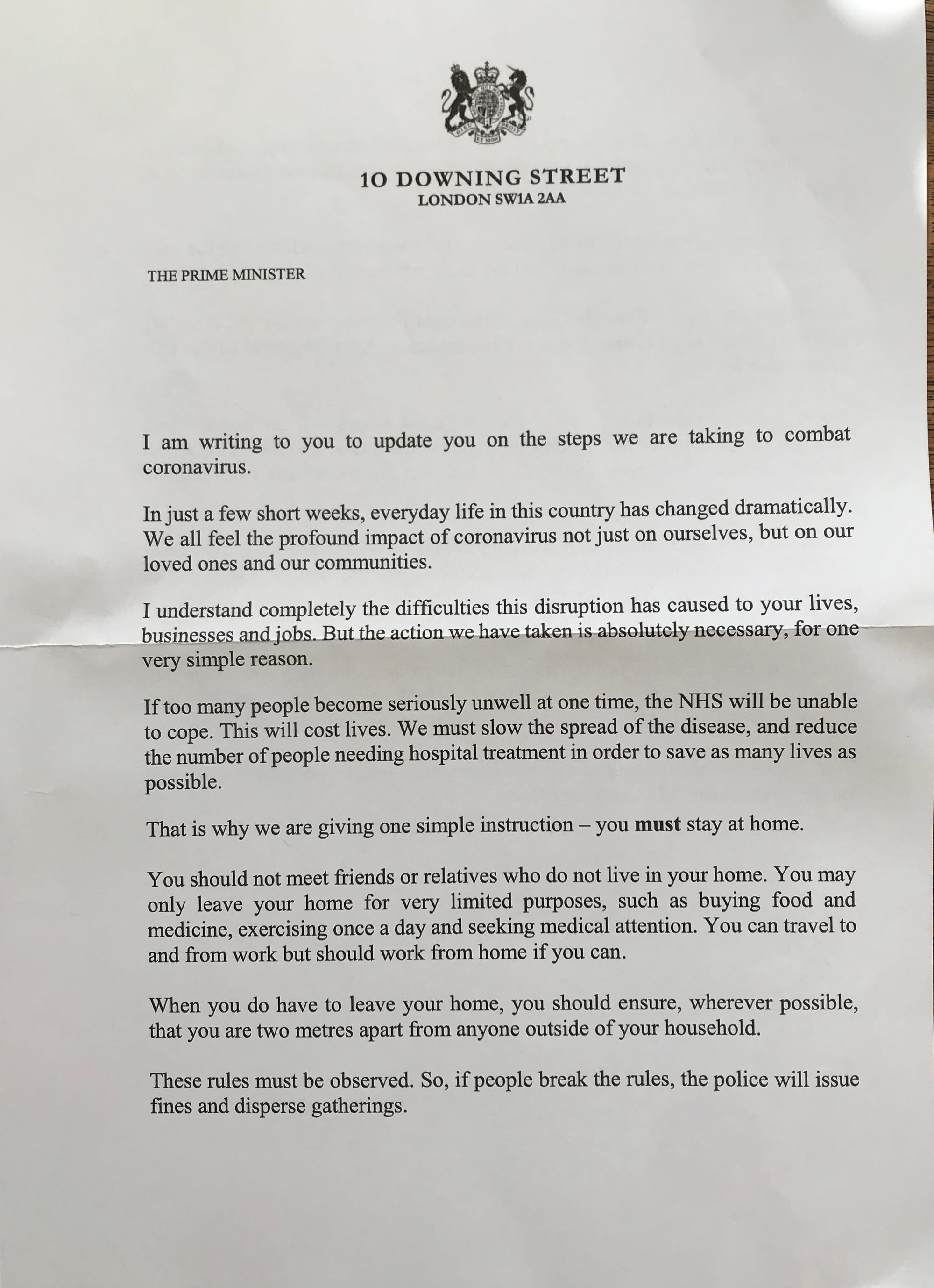 In today's post was this letter sent from 10 Downing Street to all households across the UK, signed by the prime minister, a letter which will go down in history as a stark reminder of the changes brought upon us and the whole world as a direct result of this killer virus.