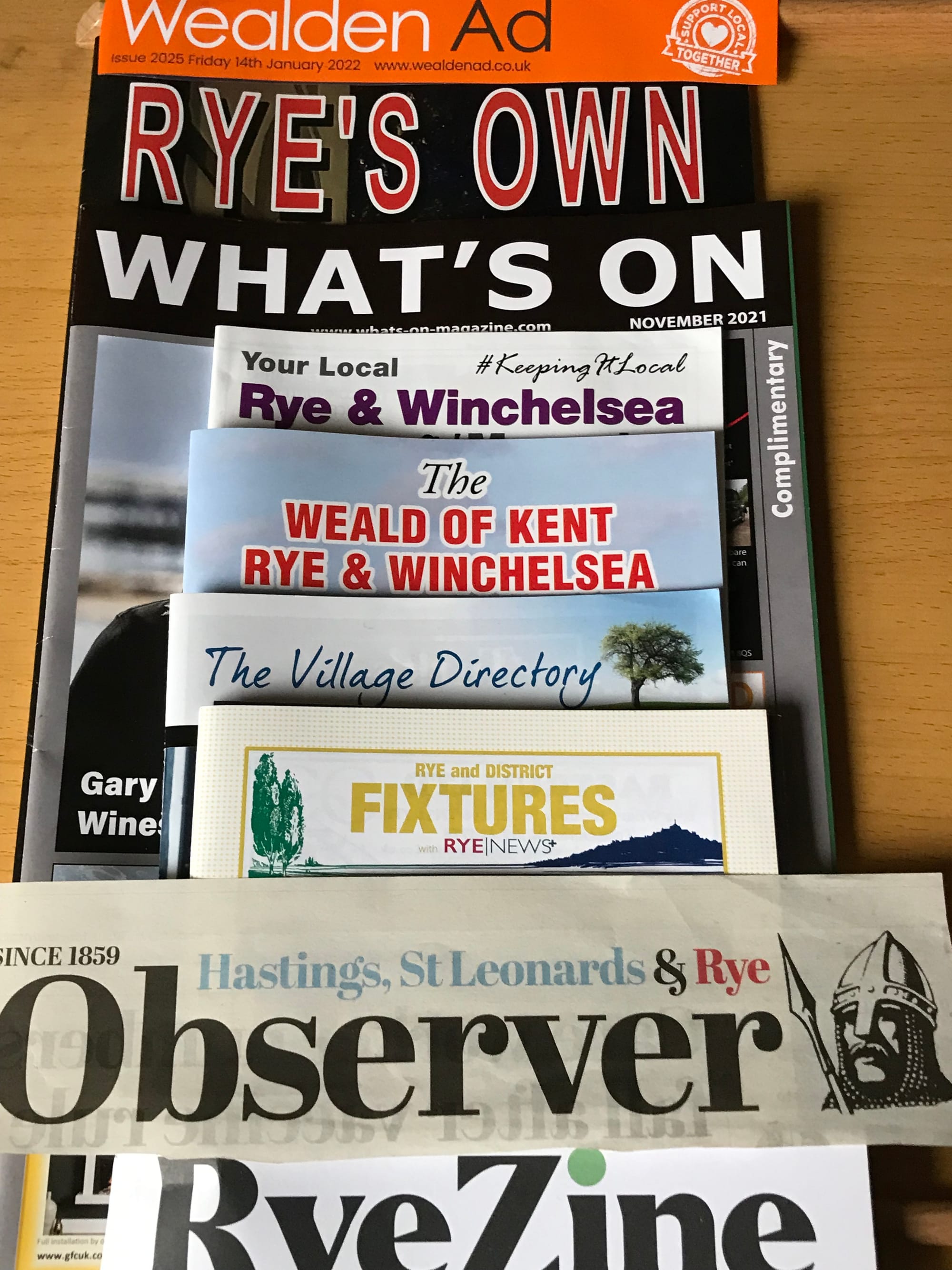 At present the local newspapers and magazines in print are “Rye’s Own” and “Rye Fixtures”, two well established publications still going strong. The weekly “Hasting and Rye Observer” which has increasingly less local news and information is purchased from newsagents. The weekly “Wealden Advertiser” based in Hawkhurst was established in 1980, is distributed in Rye. “What’s On” based in Battle has been established for 22 years and is a monthly lifestyle magazine. The monthly “Village Directory for Tenterden & Rye” is still available, as is the yearly “Weald Of Kent, Rye & Winchelsea Directory”, both delivered by Royal Mail. The “Rye & Winchelsea Community Ad Magazine” was recently relaunched and another new magazine is “Ryezine” which about local people of Rye.