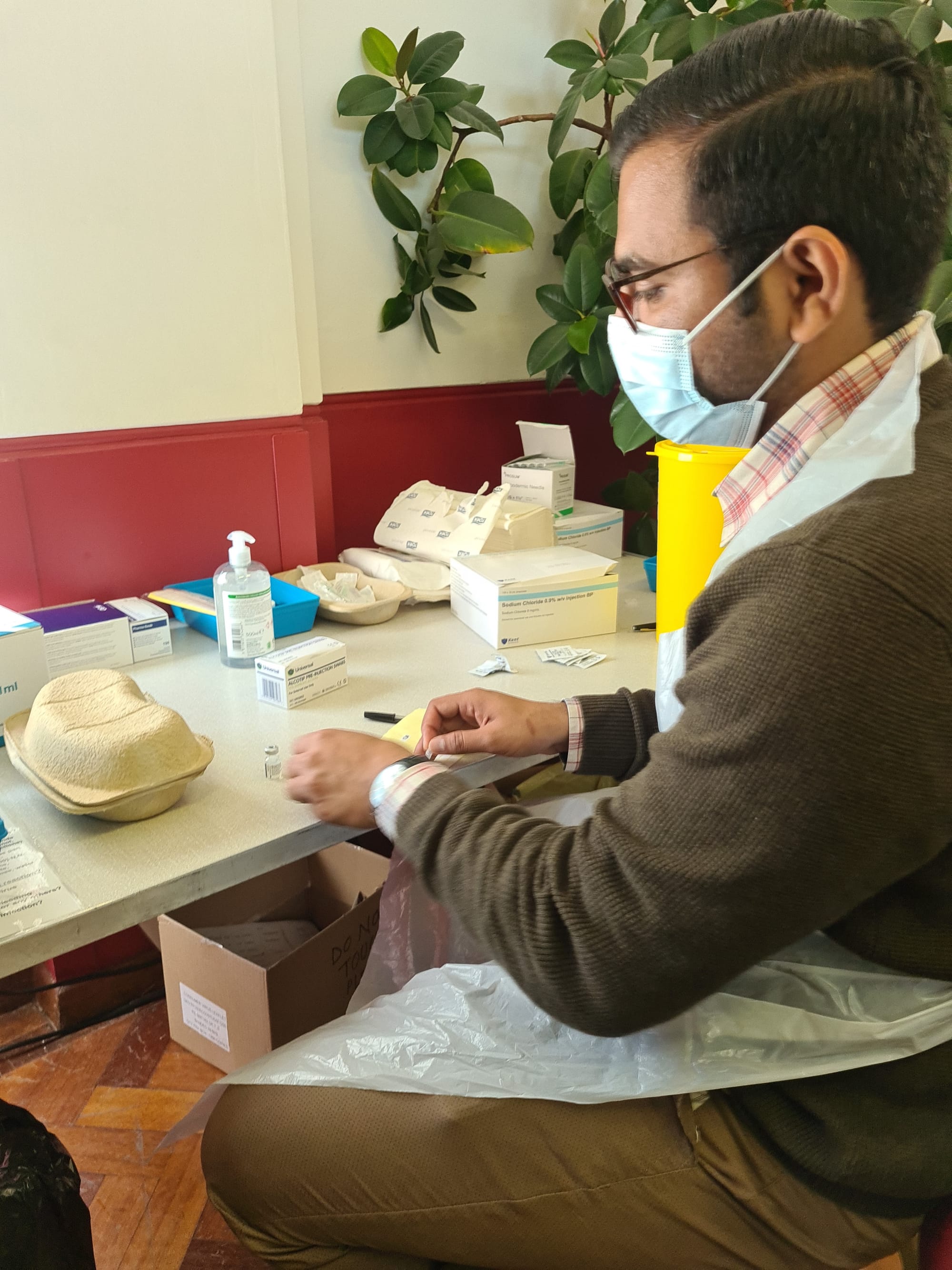 There is much going on behind the scenes to deliver the vaccine. In addition to logistics, cleaning, marshalling the volunteers and clinical staff mostly by social media, the storage and preparation of the Pfizer vaccine requires care and skill. In Rye, this task is handled mostly by Venus, one of the Ticehurst team. The delicate operation involves dividing up the bulk vaccine, diluting and measuring it out into individual doses. At stages it has to be carefully turned to ensure that it is mixed but not disrupted.