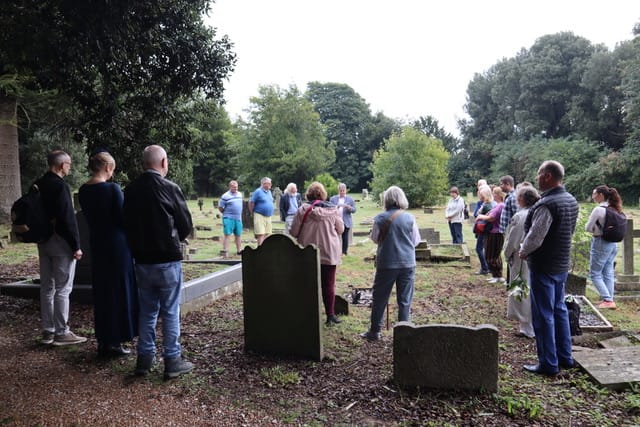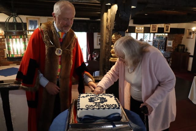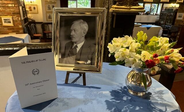 The Friends of Tilling's special day included a walk to Benson's grave at Rye Cemetery. Thankfully the rain held off. This was followed by the town crier of Rye, Paul Goring welcoming the Friends to Rye in his own inimitable style, outside the Mermaid Inn. Then a ploughman's lunch, which included a reading, this year an excerpt from Mapp and Lucia, where Lucia visits Mallards with a view to renting it, this read by Richard Crowest. The lunch was attended by the mayor and mayoress of Rye, and the mayor, Councillor Andy Stuart and Susan Sexton a great-great niece of Archbishop Benson (EF Benson's father), cut a special twentieth anniversary cake.