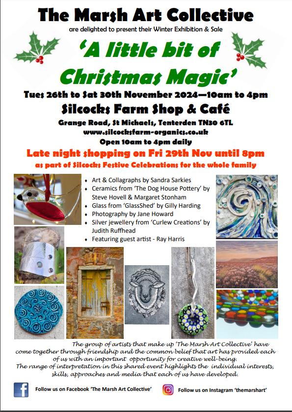 Our next exhibition is from Tuesday to Saturday November 26-30 2024, 10am-4pm daily, with a special late night evening on Friday, November 29 until 8pm, where Silcocks will be fully open with their shop, butchers and cafe. There will be refreshments and fun-filled activities, live music, fresh Christmas wreaths for sale and much more to see.