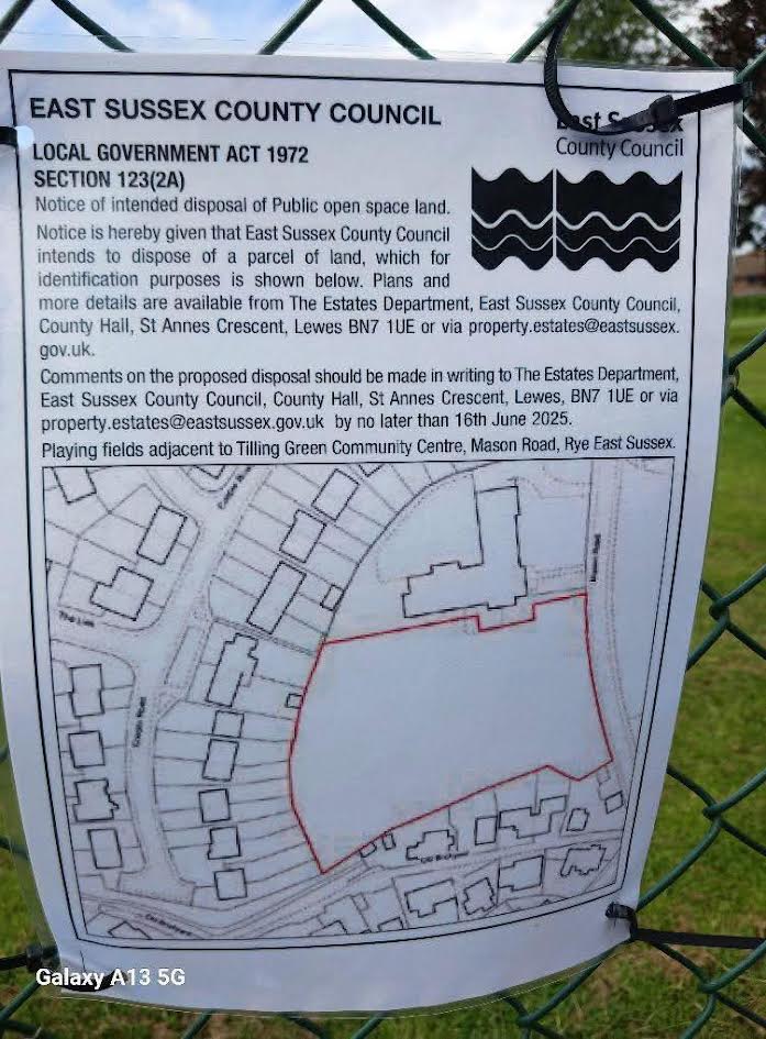 At Tilling Green, notices have now been posted explaining the sale of the playing fields next to the community centre. Comments on the proposal can be given to ESCC until June 16. Martello have put forward plans for homes on the site and the newly formed Rye Community Land Trust is also looking into building new housing on the fields.