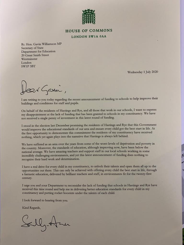 "However, I am deeply disappointed that Hastings and Rye has missed out on this vital funding. That is why I am urging the education secretary to reconsider his decision and to provide schools and children in this constituency with the funding they deserve. I have written to him urging him to think again.”