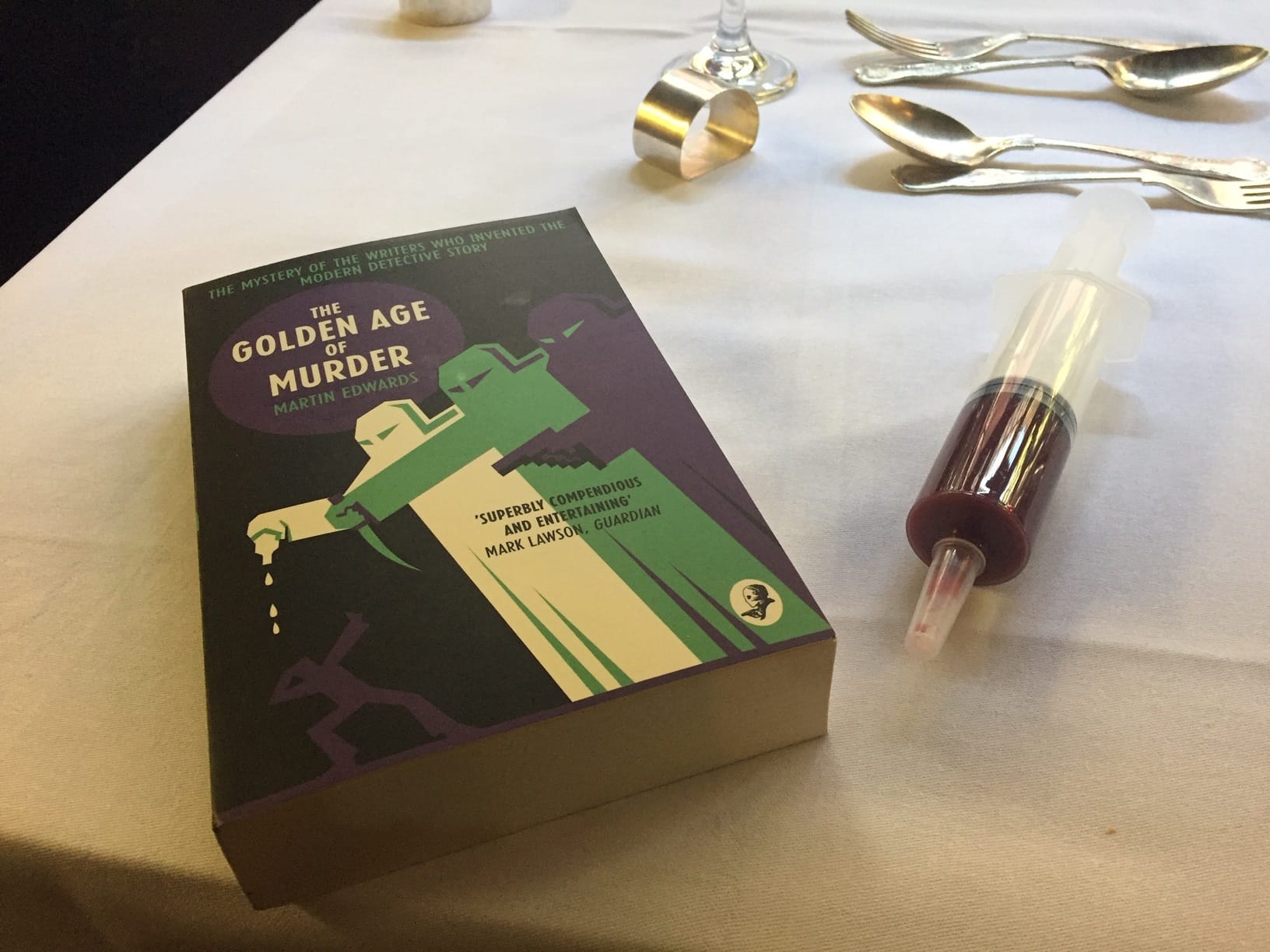 Then at half time some of the guests adjourned to the Mermaid for a four-course slap-up lunch. The meal consisted of death cap soup, sinamon lamb, a lethal injection palate cleanser and death by chocolate. The lethal injection was of course served in a syringe.