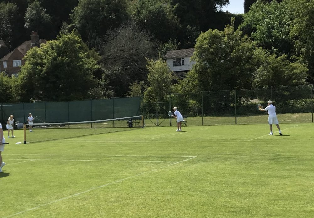 We have reported recently on a series of tournaments for the juniors of Rye Tennis Club against juniors from other nearby clubs. Last Sunday, June 24, it was the turn of the other end of the age spectrum when head coach Frances Candy put together a team of older players for a doubles match against The Green Tennis Club from Hastings. The Rye team consisted of two pairings: John Spencer (with Viggie Litchfield taking over from him later) and Caroline Carver in team 1 and Margaret Coltman and John Minter in team 2. Each individual match consisted of two sets and, if needed, a final tie-break to decide the winner.