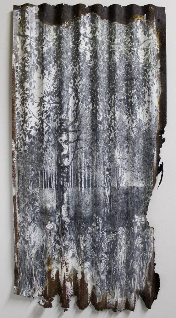 Scarlett Woodman (b. 1994) collects both her imagery and her materials from her surrounding landscape. Through this process of exploration and discovery Scarlett hopes to achieve a better connection and understanding of her surrounding natural environment. Lockdown has allowed for a great amount of time for us all, and through the celebration of the Kentish countryside in her work, she hopes that the viewer will be inspired to pay more attention and care to the natural world. Scarlett uses a combination of both constructive and destructive processes in her practice including painting, drawing scratching and burning. Working mostly with reclaimed building materials, the result is always a softening. Taking these hard, harsh, heavy objects salvaged from the landscape, and transforming them with trailing branches into something that appears serene and delicate. Finding peace in the wilds of nature and displaying not only its strength, beauty and resilience, but also its fragility.