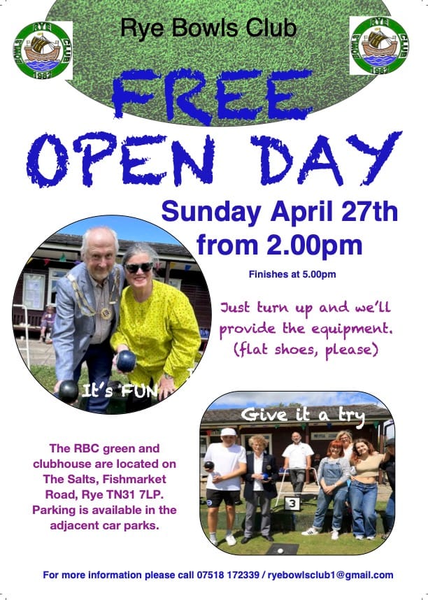 This Sunday, it's the Rye Bowls Club Open Day, which starts at 2pm on The Salts. The club has been facing an uncertain future because of council budget cuts but starts the 2025 season with a large increase in membership and big plans for the clubhouse and green.