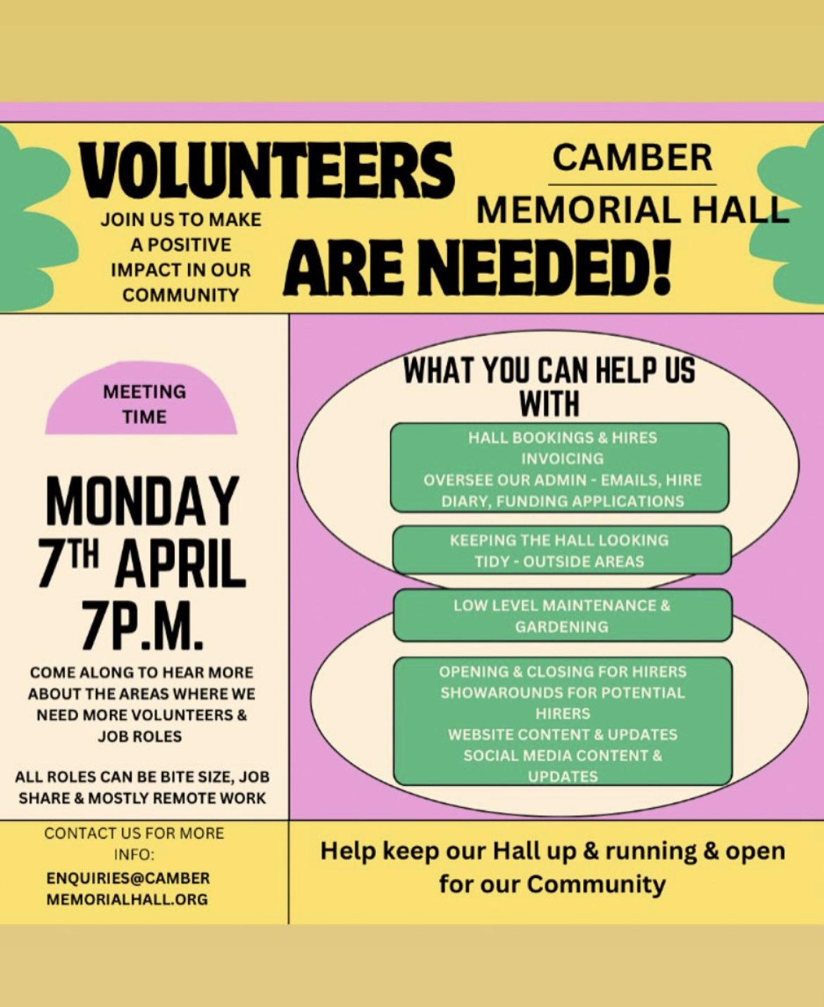 As we reported last month, Camber Memorial Hall could close at the end of July because of a lack of volunteers. Now a meeting has been called next week to encourage people in Camber to get involved.