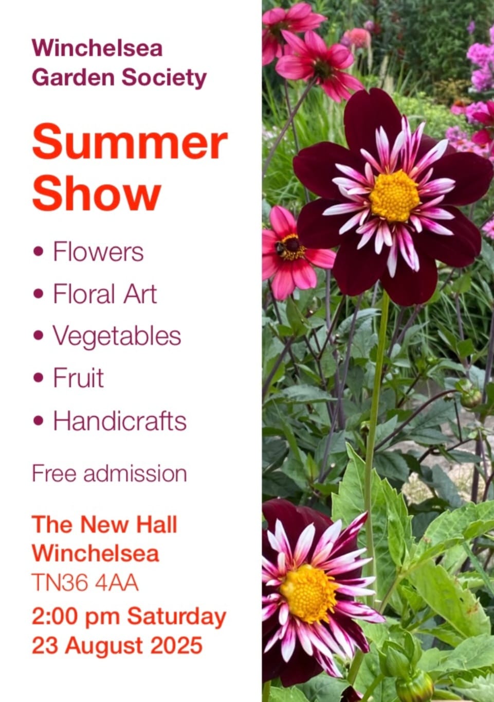 On Saturday, August 23 the Winchelsea Garden Society hold their summer show. There will be several categories on display including roses, fuchsias, sedums and ferns; dahlias have their own section, as does floral art.
