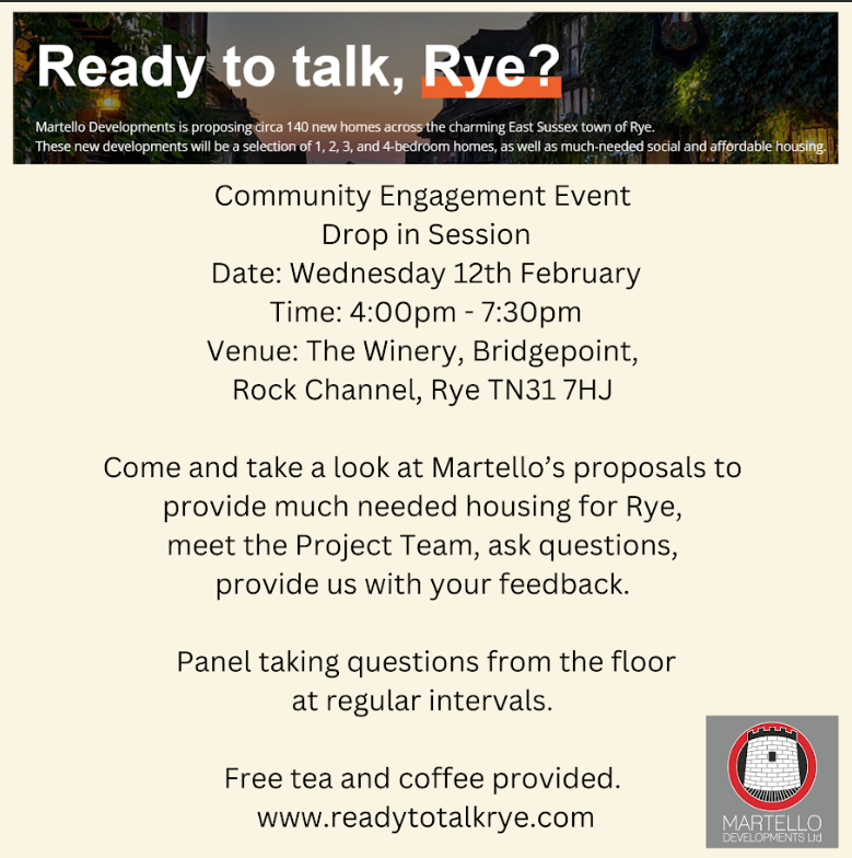 Martello Developments plans for 140 new homes in Rye were revealed before Christmas, with building proposed on four sites: Tilling Green, Rock Channel, the former Freda Gardham School, and on Rye Harbour Road.