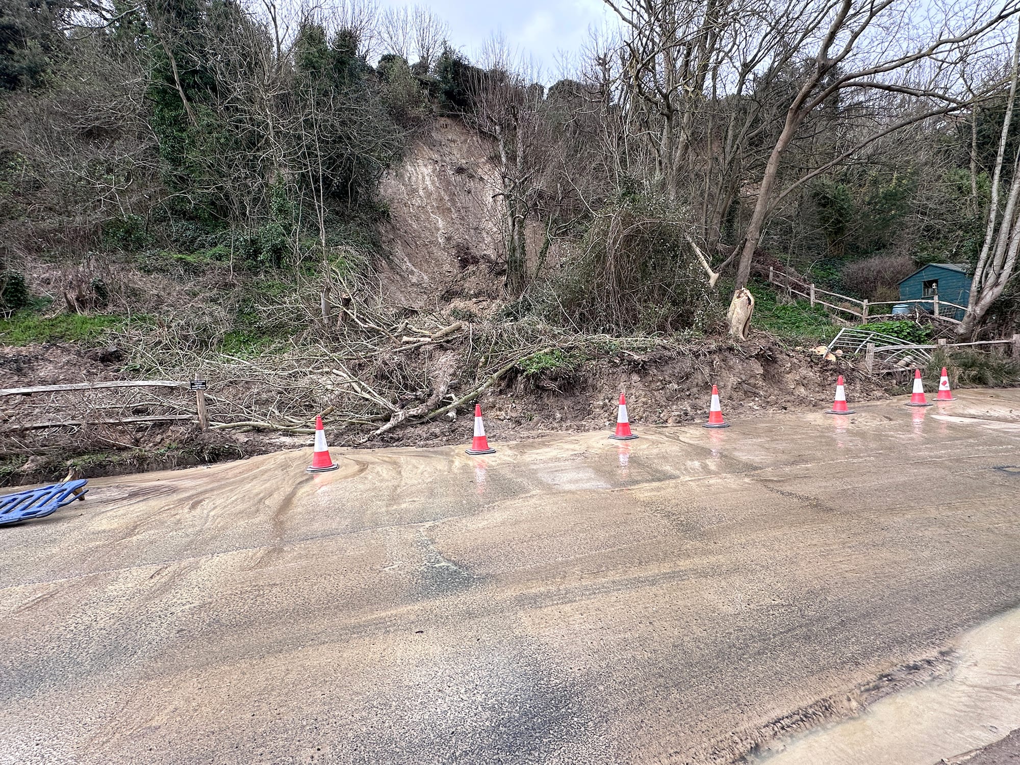 A spokesperson for East Sussex Highways told Rye News: "An inspection by our engineers has concluded that the likely cause of the landslip was softer material, which sits on top of the solid cliff face, becoming saturated in the recent rains causing it to become unstable and slump away from the cliff. We are liaising with the landowner to ensure the land is surveyed and ultimately stabilised, and that the landslip will be completely cleared. In the meantime we will be installing two-way traffic lights to enable the road to be reopened and to ensure the safety of road users. We would like to thank residents for their patience during the road closure.”
