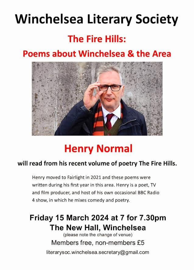 Also on Friday, March 15 Winchelsea Literary Society welcomes Henry Normal to the New Hall at 7:30pm. The poet's appearance follows previous speakers Ian McEwan, Charles Moore and Sir Anthony Seldon. Henry, who lives in Fairlight, is in the middle of a nationwide tour with fellow poet Brian Bilston. If you missed him at Bexhill at the beginning of the year, this is your chance to hear him read his poetry. As well as writing and radio, Henry set up Baby Cow Productions with Steve Coogan and won a BAFTA for 'services to television'.