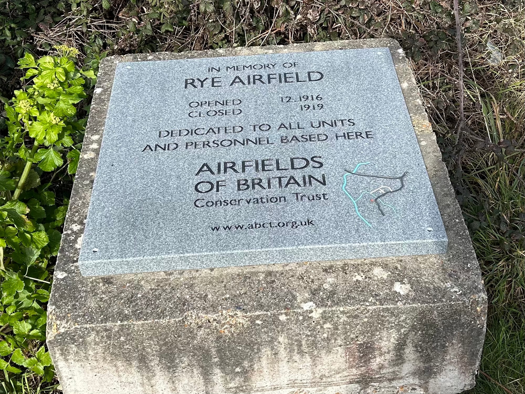 You can find the memorial on the Camber Road. The former airfield was located to the right of the road between the first two bends after leaving the main road. More on the history of Rye’s air history and the original memorial plaque in this Rye News article.