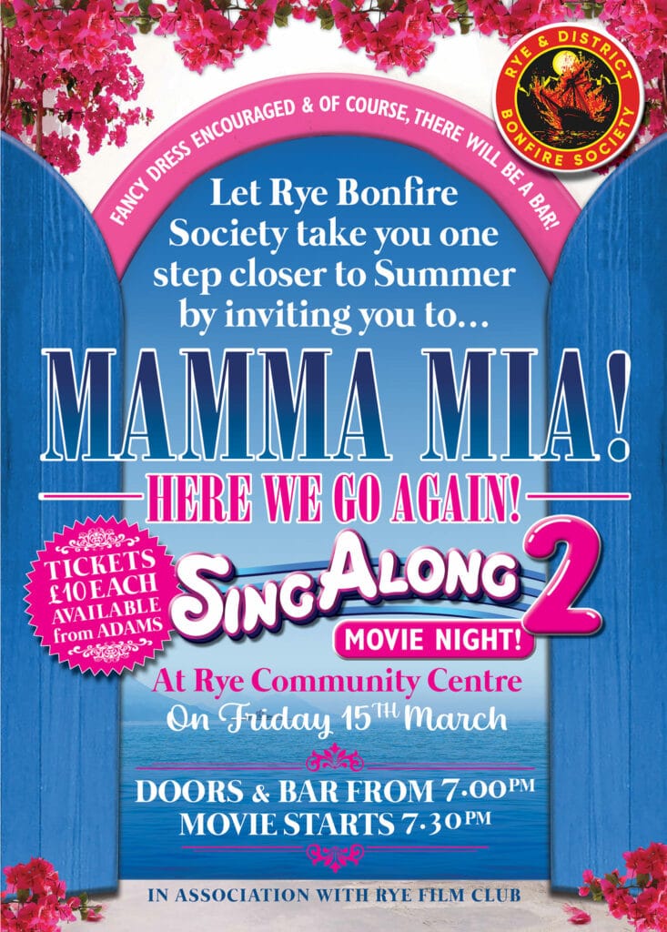 Rye Bonfire Society has a fundraiser on Friday, March 15. Two months on from the last Abba singalong, the Mamma Mia 2 movie night is at the Rye Community Centre starting at 7.30pm.