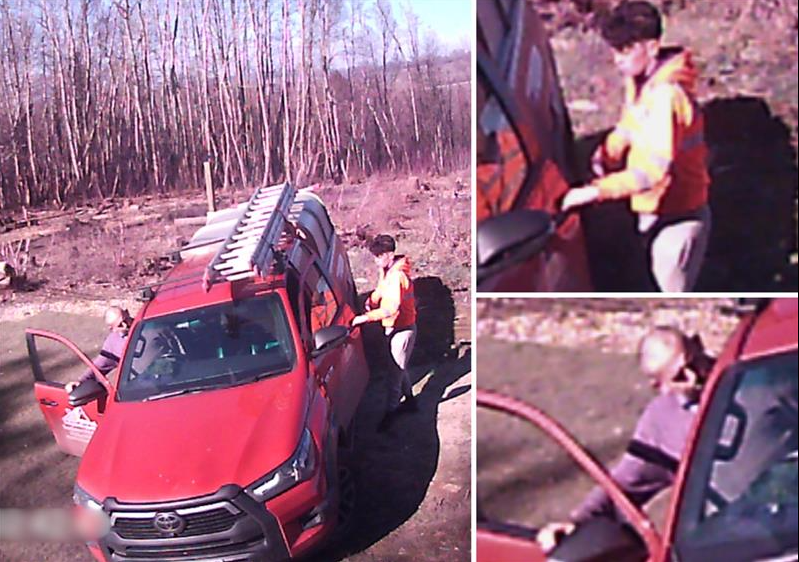 Two people were seen driving a red Toyota Hilux with ladders on the roof and a logo on the driver’s door.