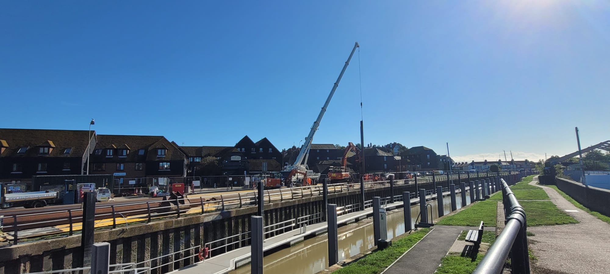 Defects and movement in the piling that keeps the harbour walls in place were discovered during the installation of the new floating pontoon, ladders and mooring rings. The new piles are being driven into the ground next to the wall by the A259.