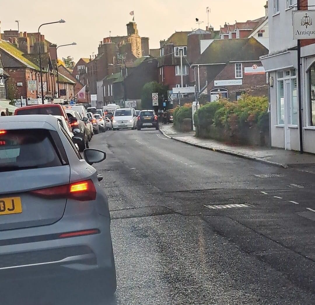 Traffic faced long delays, with queues almost as far as Winchelsea and cars at a standstill on Cinque Ports Street and Landgate.