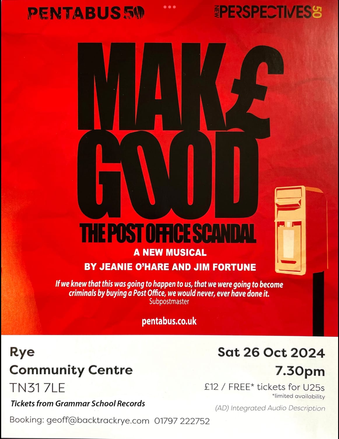 A new musical about the Horizon Post Office scandal Make Good: The Post Office Scandal is being performed at Rye Community Centre for one night only on Saturday October 26.