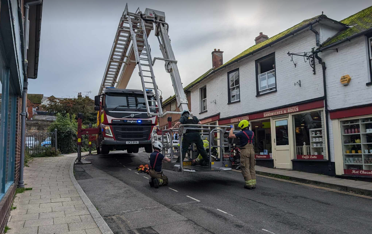 Cinque Ports Street in Rye was closed for part of Thursday afternoon October 17 when East Sussex Fire and Rescue came to the help of a person who had become unwell on the first floor of Jempson's Cafe. A turntable ladder was used to remove the person from a first floor window. Two fire appliances and ambulances were also at the scene.
