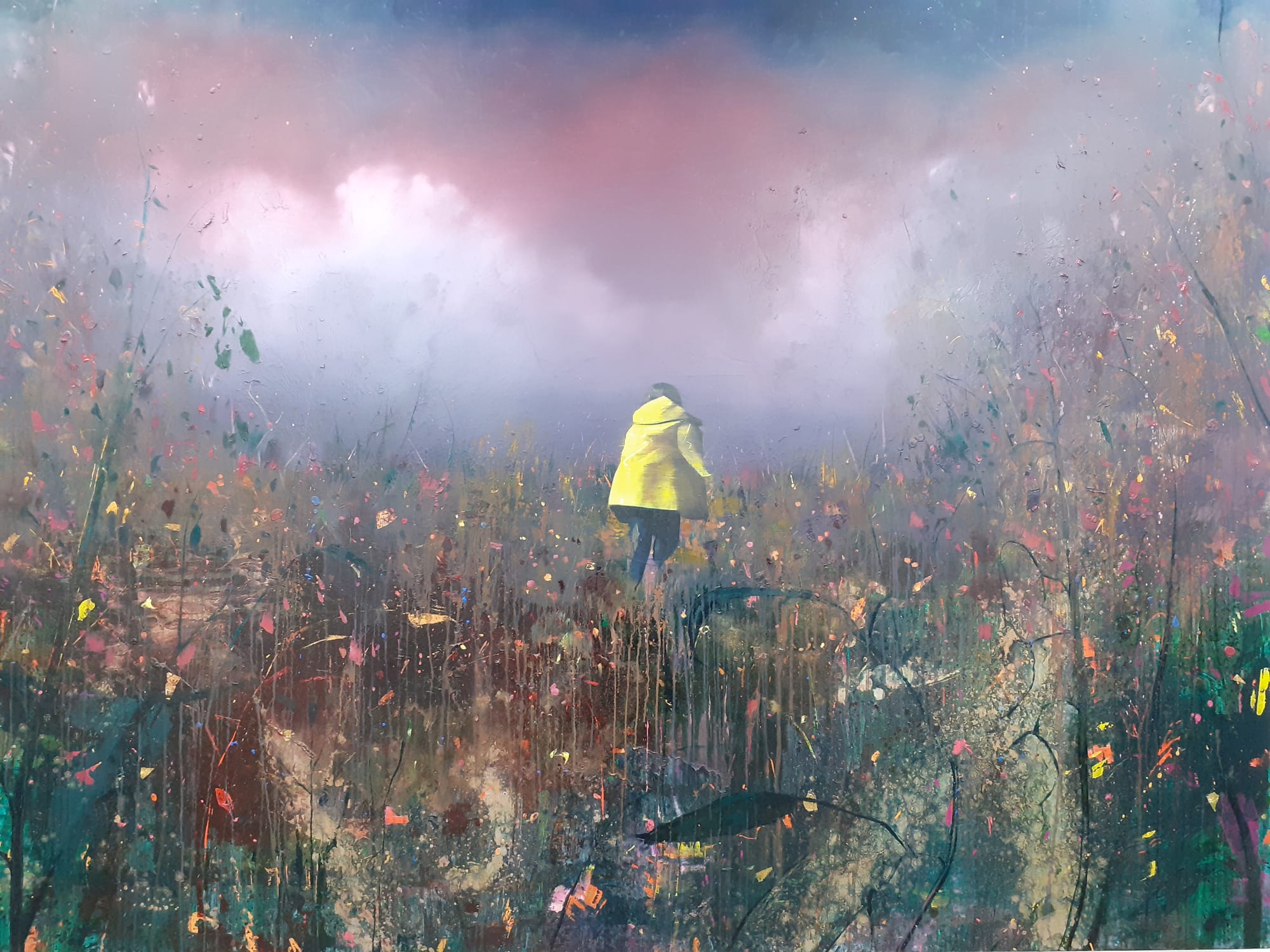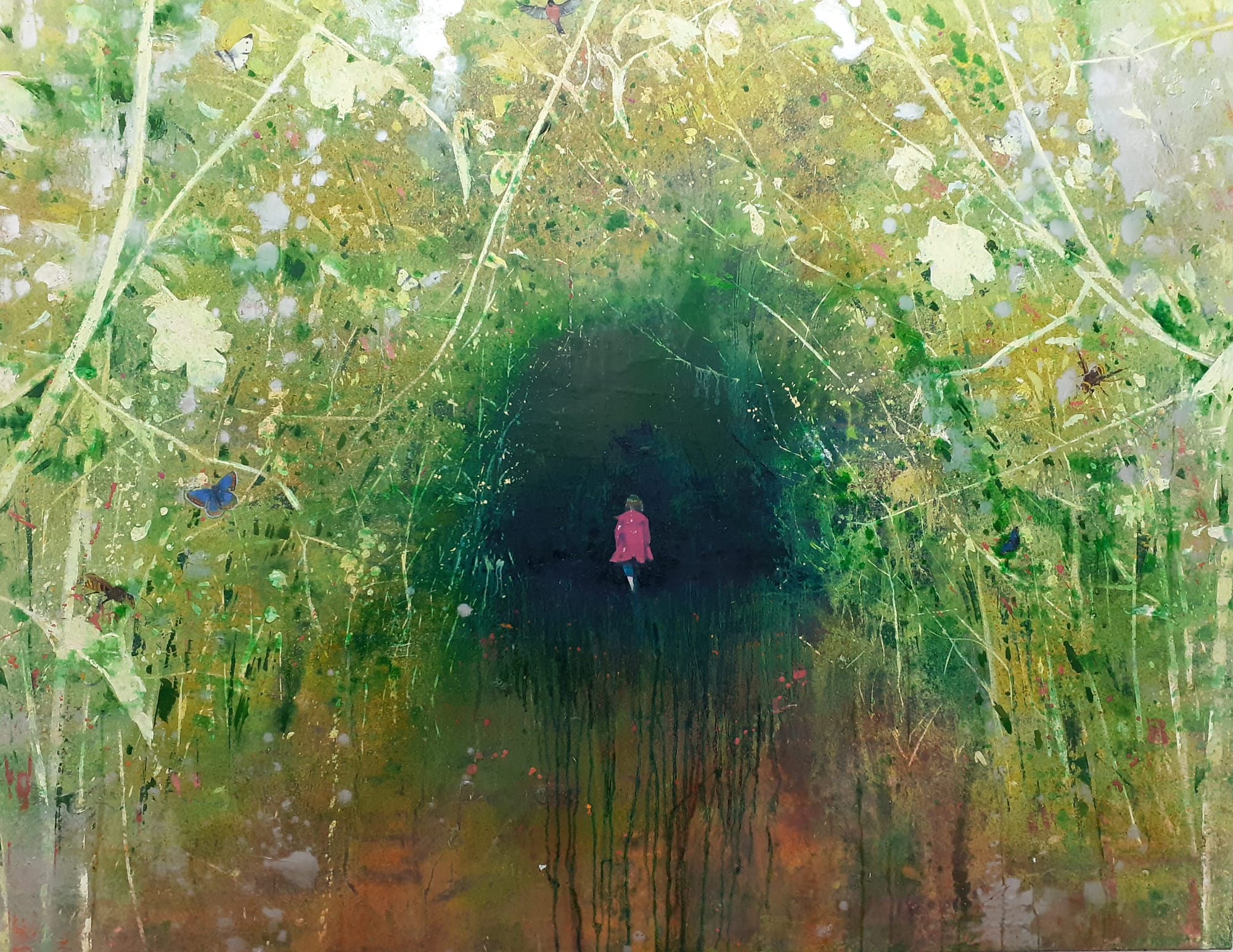 The meadow is in contrast to the arch the child goes into. The different colours in all of the pictures is effective, drawing the viewer into its depth.
