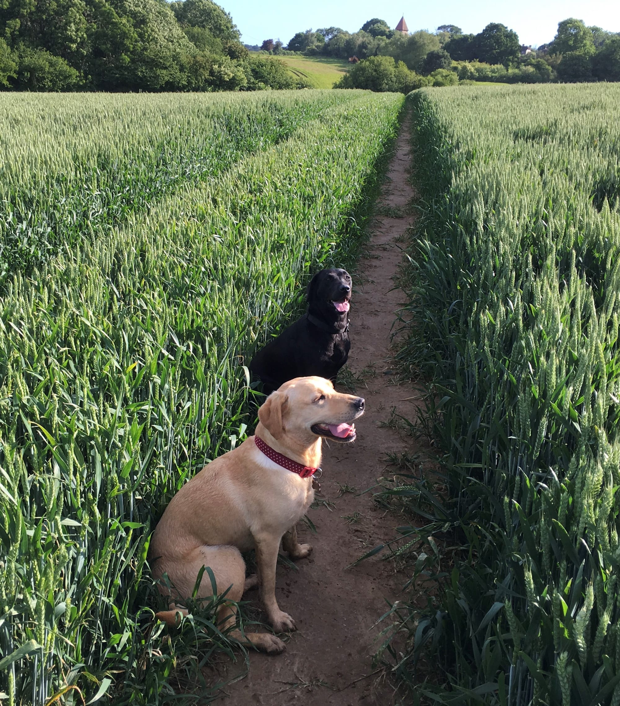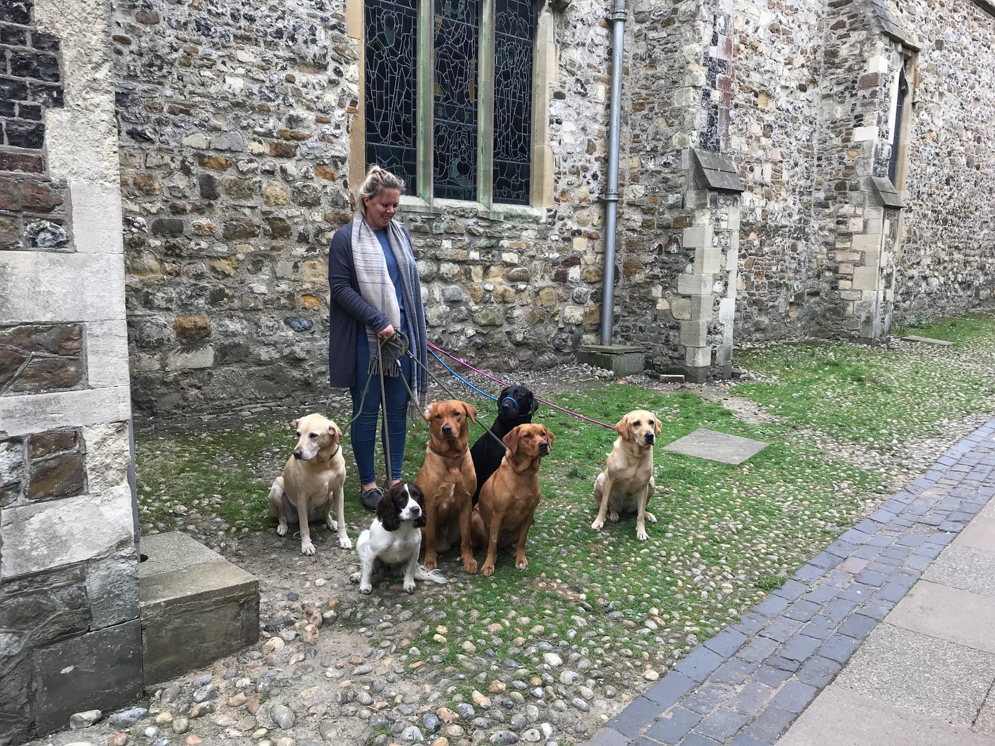 Hopefully these photos will bring a smile, and the main shot is of my son's working labrador, Echo, poking his tongue out at the cows on the farm, and the nonchalant look on the cows' faces suggests they aren't in the least bit bothered. The second shot includes Echo's half sister Hollie, sat outside St Mary's church last summer, with four other four legged friends as they wait patiently to continue their walk.