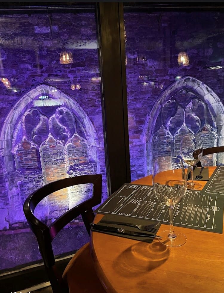 If you have never been inside this building you are missing out, it backs directly onto the 14th century former monastery on Conduit Hill, a spectacular backdrop, especially at night when the floodlights illuminate this magnificent building which you can enjoy through the picture windows, as you indulge in all the Mediterranean delights from the menu. Incidentally, the Monastery was converted some time ago and is now home to Alex Macarthur Interiors.