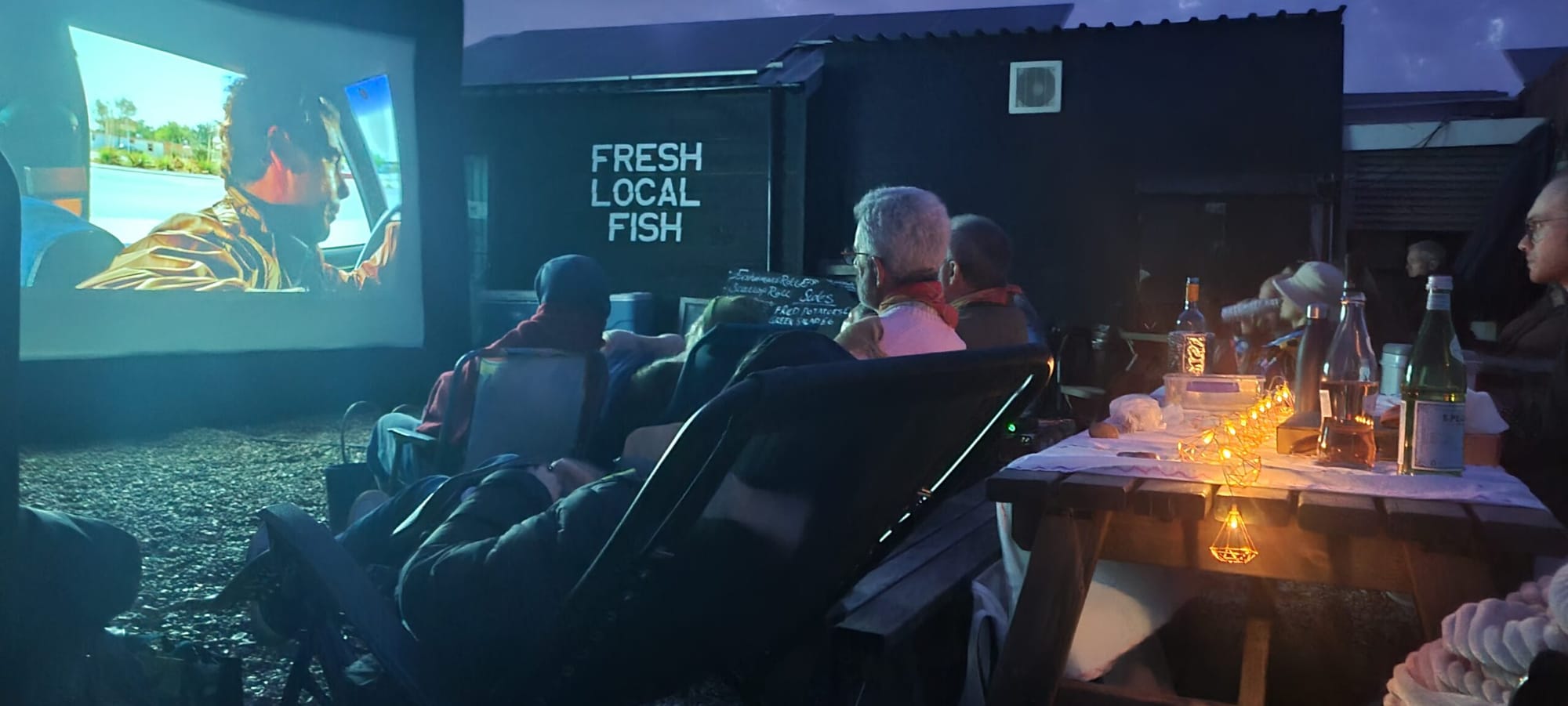 People gather before the film for drinks and delicious fresh pizza (from locally-based Baker That Bakes Pizza) accompanied by music until the light fades. On one of the hottest and most humid days of the summer, it was hard to imagine that we would need the long sleeves, jumpers and blankets recommended but the sea breeze that blows uninterrupted across the flatness was more than cooling.