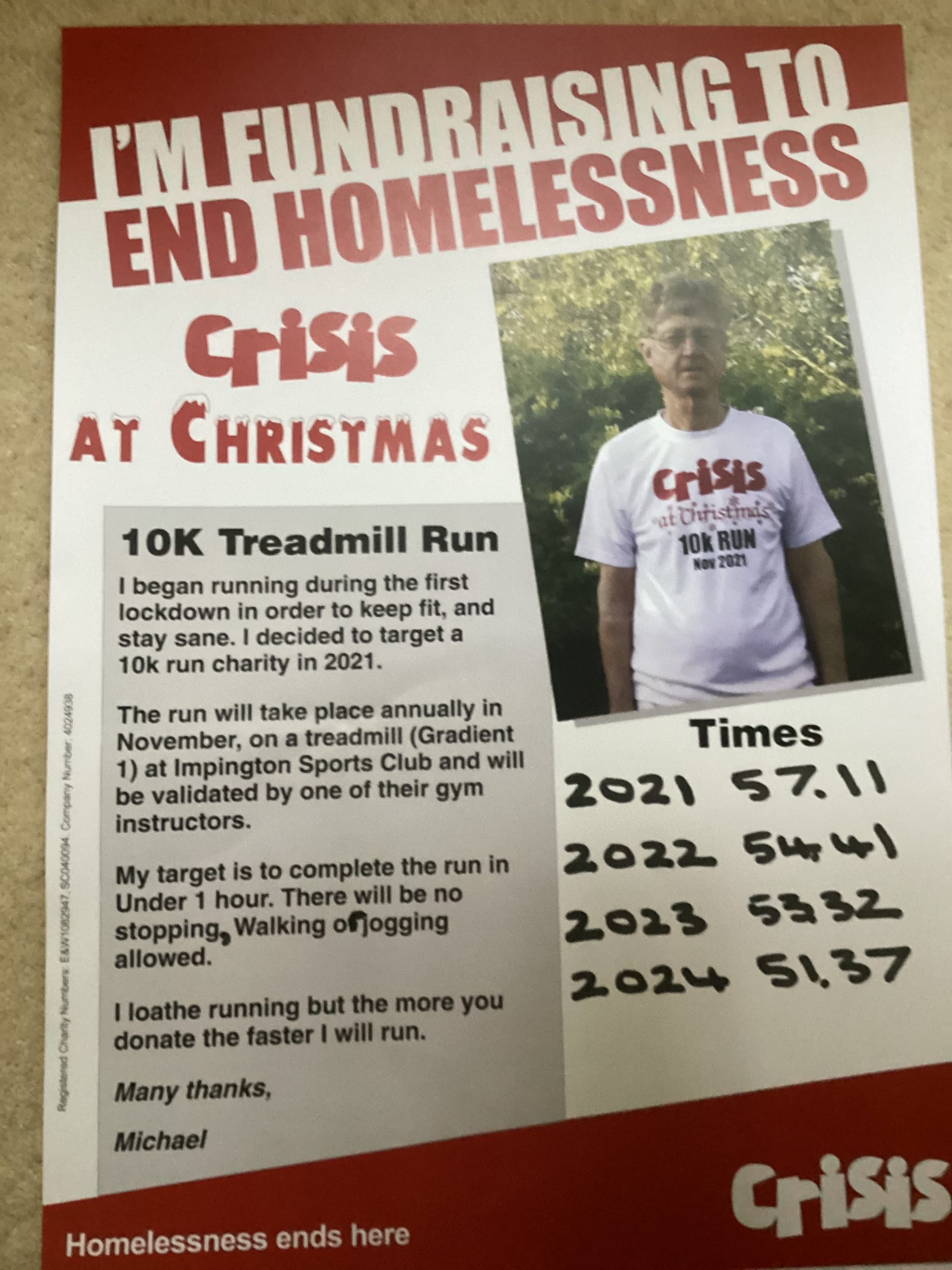 Every donated £30 donated can provide a homeless person with food, support, and accommodation over Christmas. All donations will be gratefully received by Crisis and I will keep running!