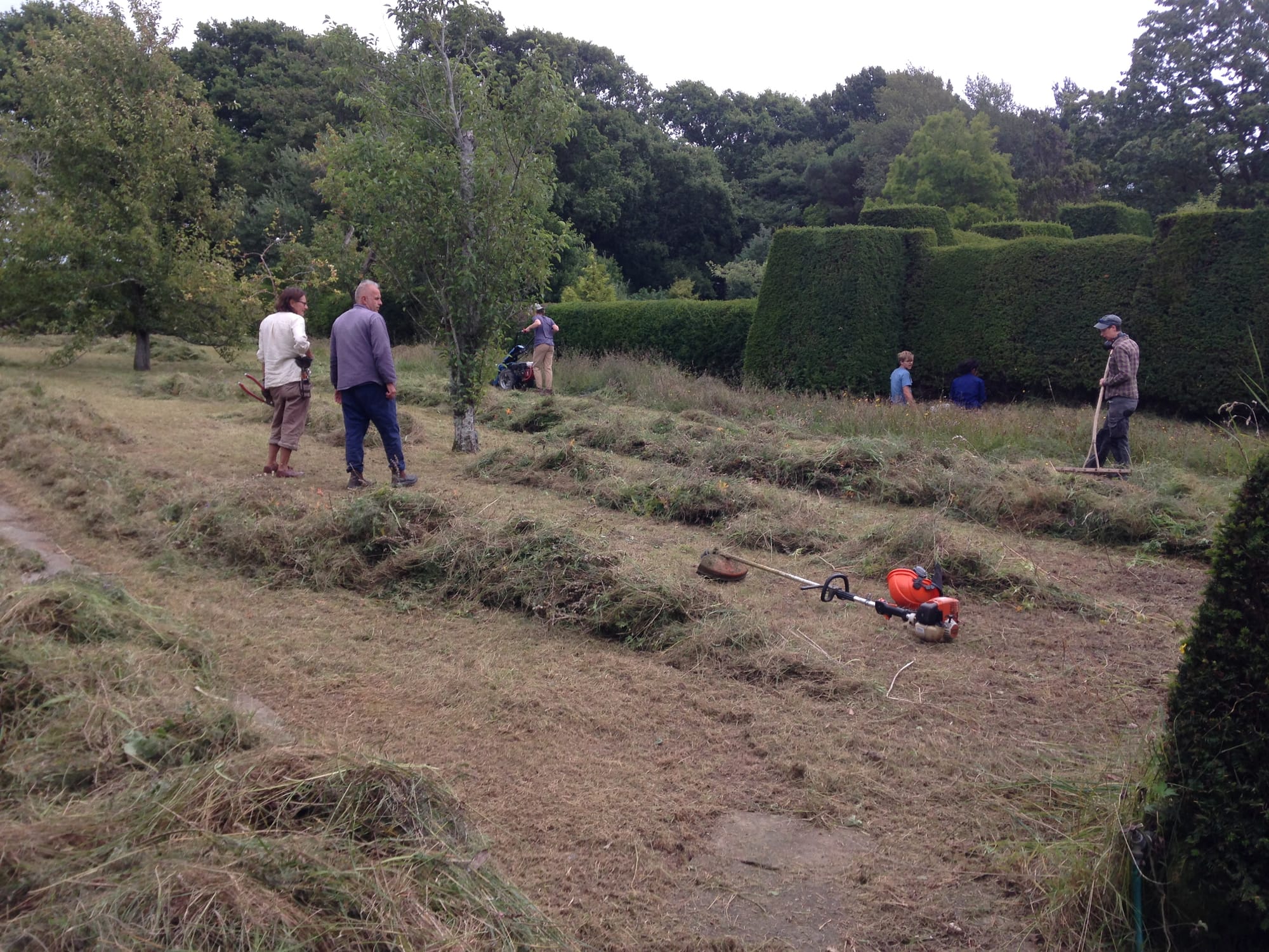 The time has now come to cut the meadows, though with more than four men and their dog, to encourage reseeding of the sward and the development of the meadow for the next year.
