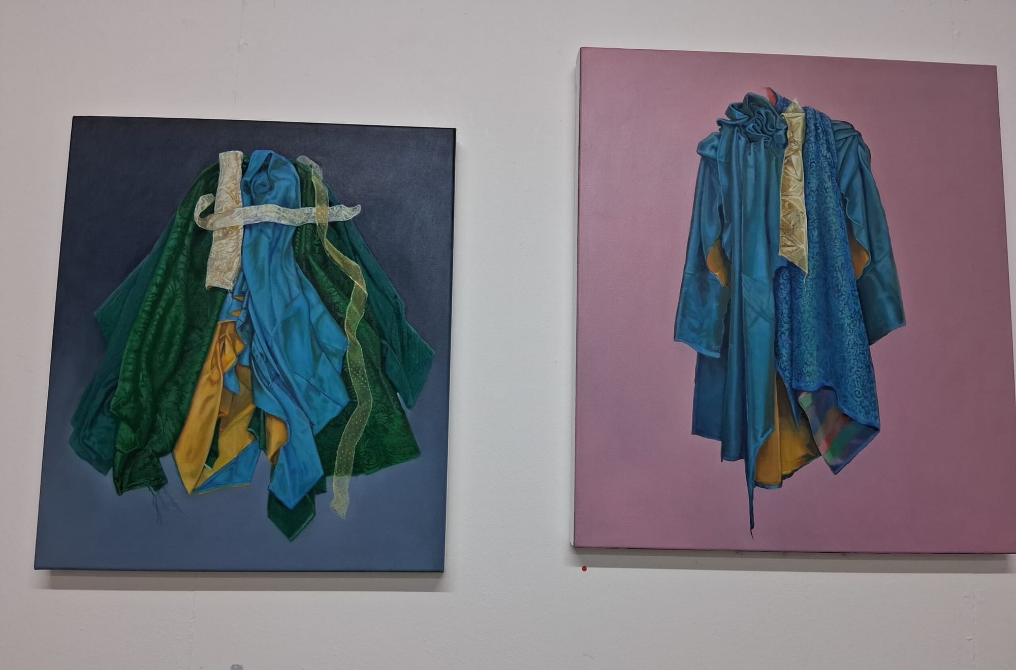 Upstairs were quite a few more studios, one of which was occupied by Jillian Eldridge. A lovely array of colourful fabric greeted the visitors, a lot of sensual Indian material of gold, blue, a special green and more. Jillian's paintings were of these textiles but arranged in a wonderful way looking like a dress or shawl but as she explained, she just drapes them as she feels like it and then paints the result. She showed in this year's Summer Exhibition at the Royal Academy.