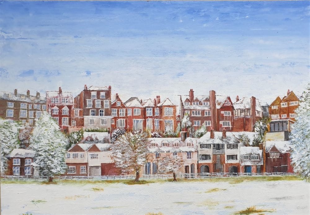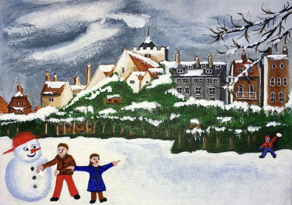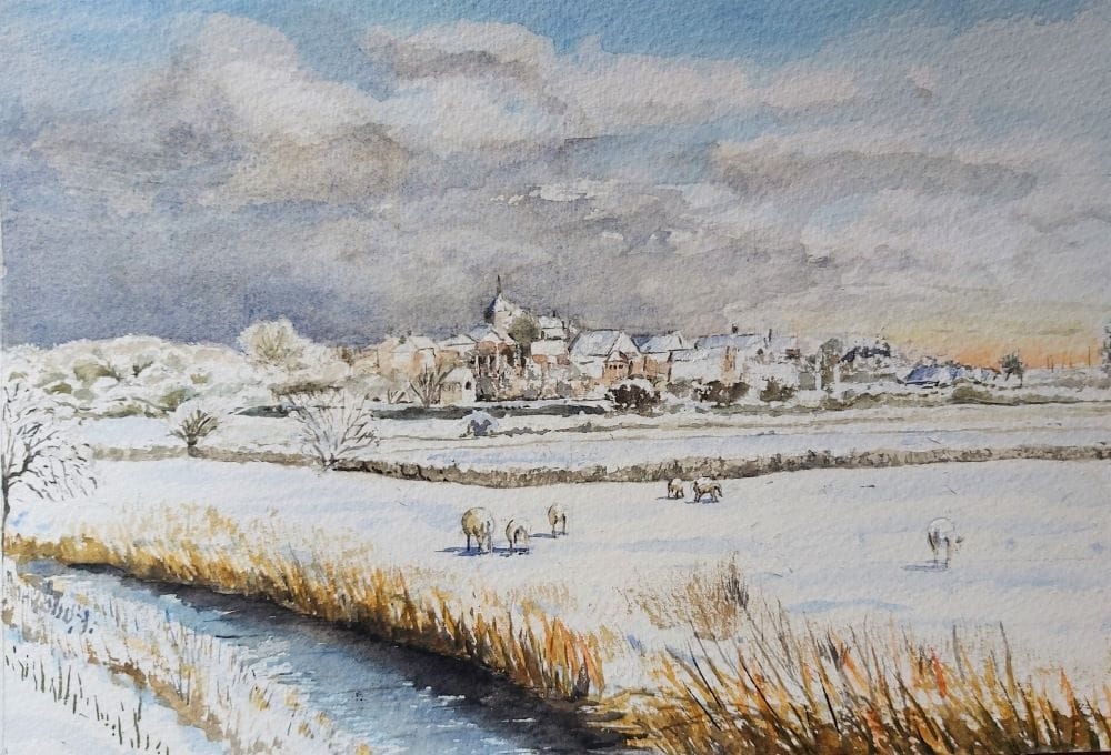 - Snowy scene of Rye from Camber castle, watercolour by Tricia Bowler
