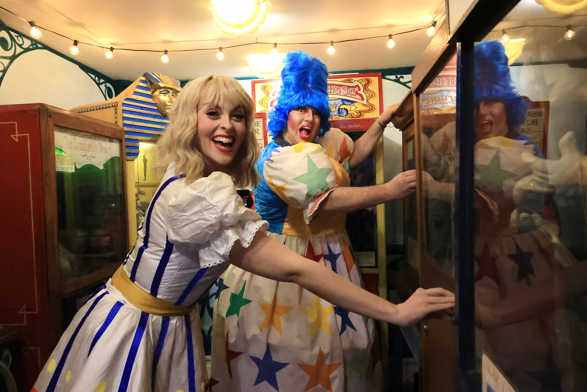 The cast couldn't contain their excitement and once inside, Dame Dolly decided to 'spend a penny' in the amusement arcade before posing with Goldilocks and Silly Billy as they sailed away in the Captain Pugwash exhibit, then it was straight upstairs for another photo opportunity in the second world war era front room display.