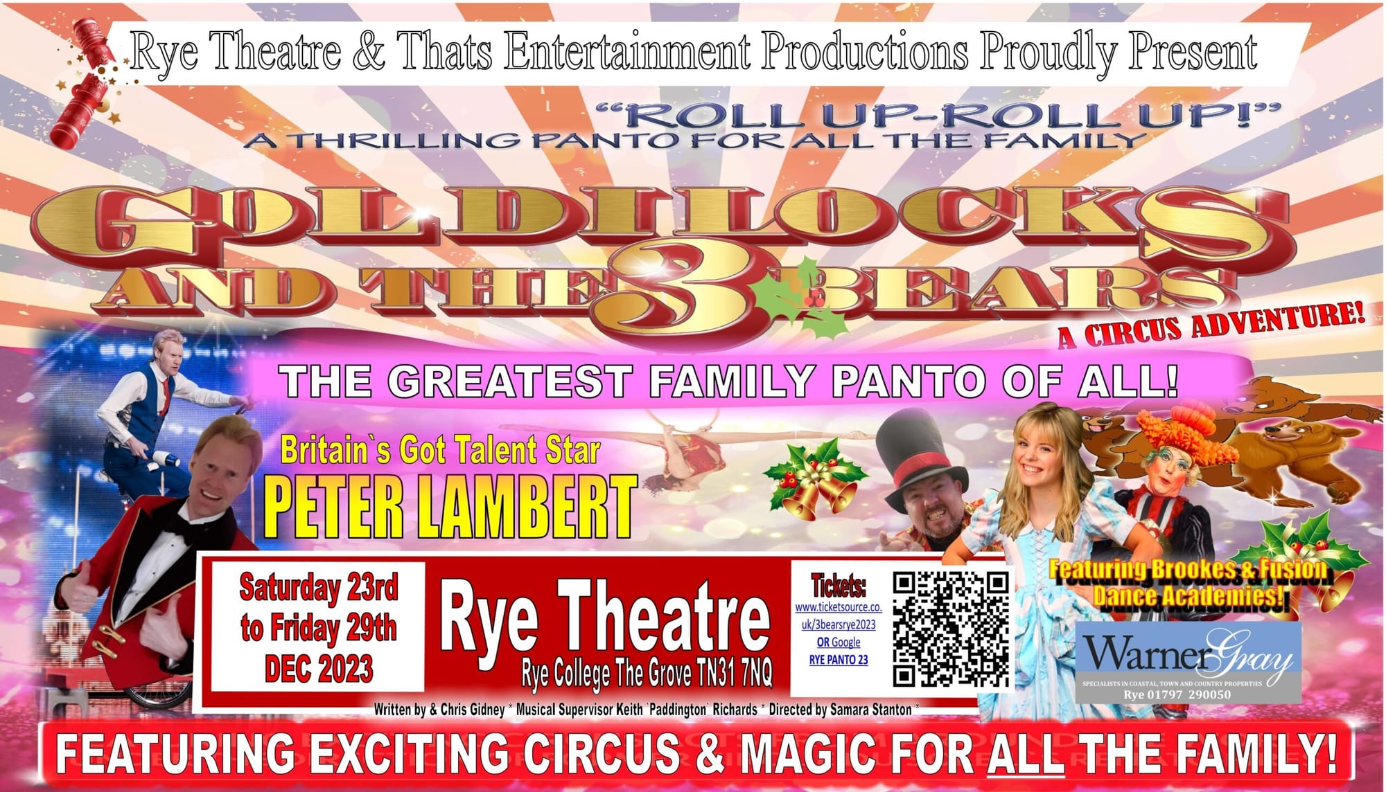Goldilocks and the Three Bears – A Circus Adventure! runs twice daily at Rye Theatre, Rye College TN31 7NQ Dec 23- 29. Tickets available from www.ticketsource.co.uk/3bearsrye2023