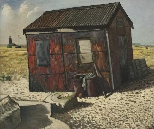 Other artists represented include Louis Turpin with his Landscapes with Romney Marsh Sheep and Brian Yale with The Nativity Hut which also captures the colours of Dungeness which are reflected in other colours selected for the designs of Romney Tweed. This hut featured in Derek Jarman’s film The Garden (1990). The painting was donated to Rye Art Gallery by the artist in memory of Derek Jarman who died in 1994.