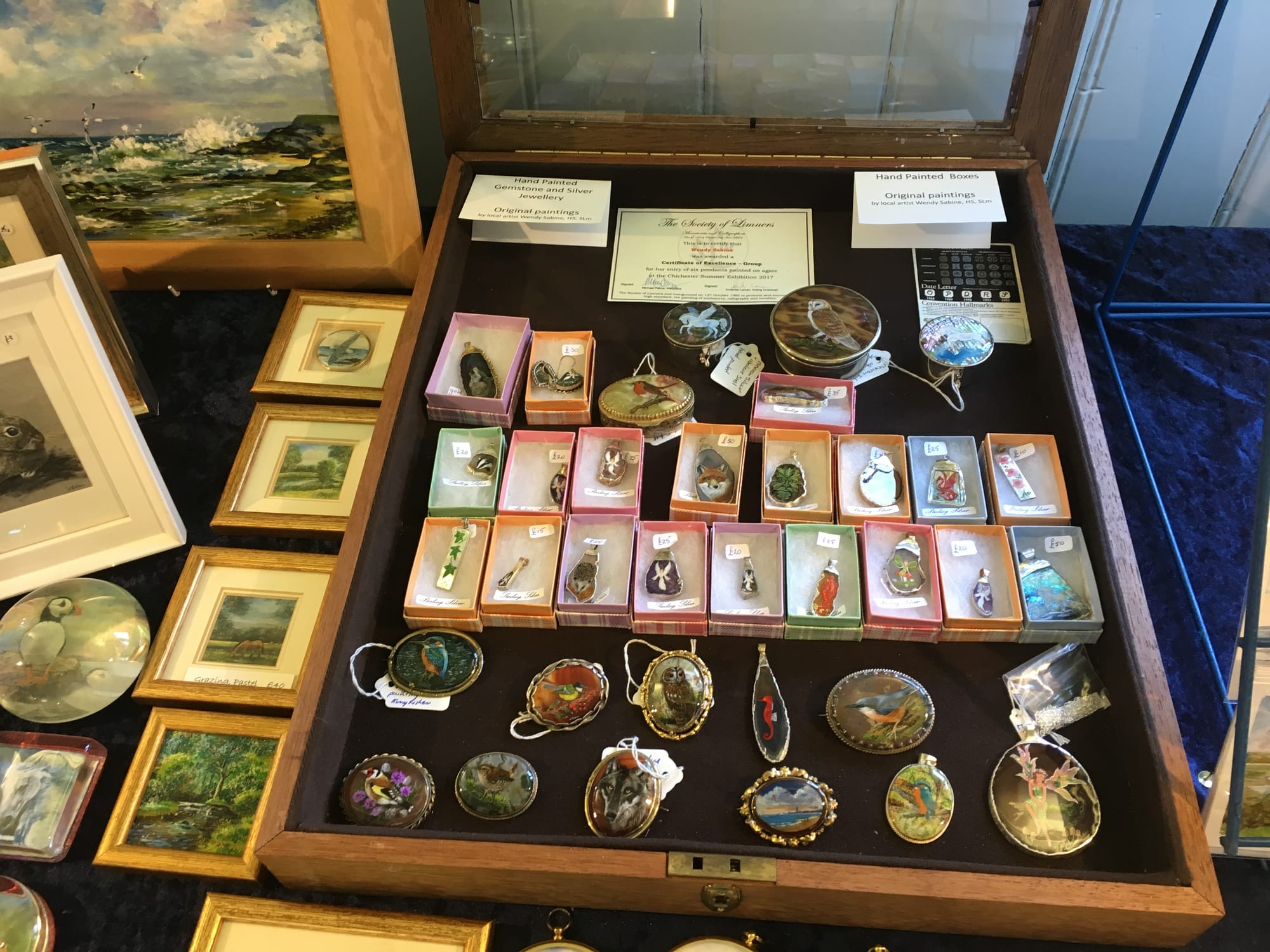 Wendy Sabine enjoys her miniature painting best, and explained that there is an overall size which cannot be exceeded for submission to the Miniature Society. Watching her paint a beautiful, tiny kingfisher was a real delight.