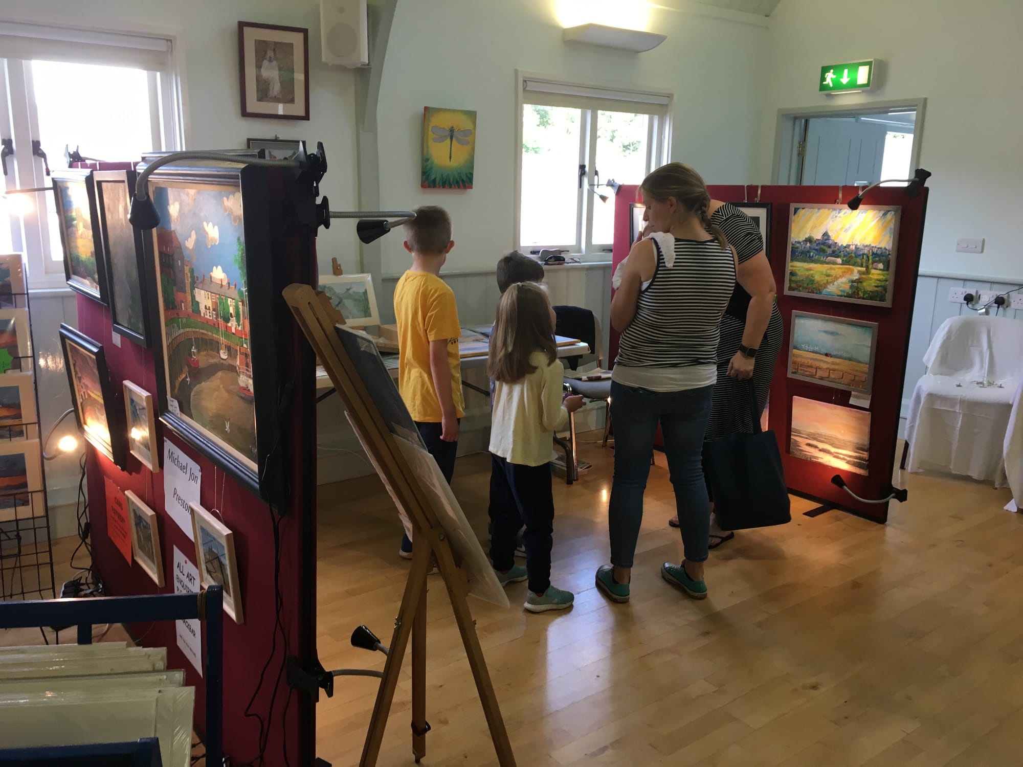 Newcomers Claire Polley and Janice Edwards were exhibiting for the first time, and one of the pictures shows a group around Claire’s display. Christine King had lovely commission portraits of animals, especially dogs, one of which had come to see his portrait. Christine specialises in house and animal portraits